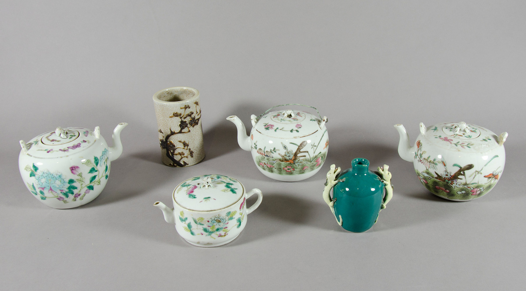 Lotto di 6 oggetti in procellana policroma tra cui teiere, decorate a soggetto orientale.