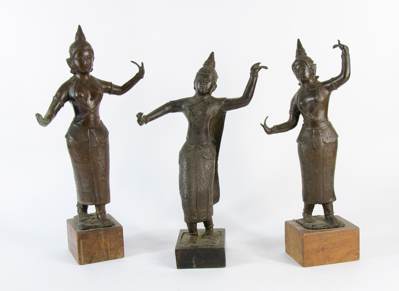 Lotto di 3 danzatrici orientali in bronzo,. H. tot cm. 49.