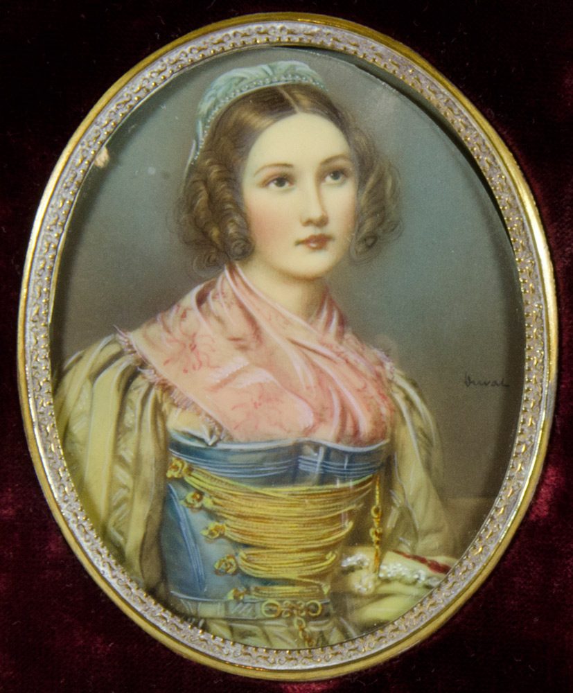 Lotto di 2 miniature dipinte raffiguranti gentildonne, entrambe firmate ed...