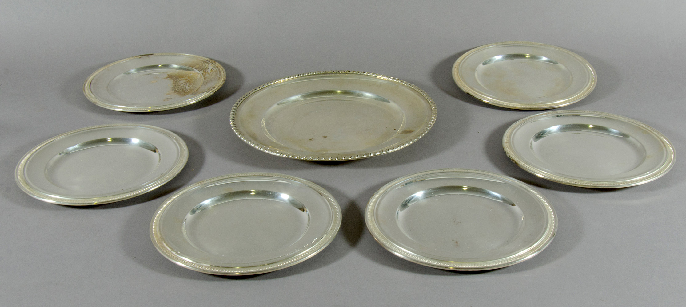 Lotto 169 | Lotto di 7 piatti in argento con bordo lavorato. gr. tot 1500.