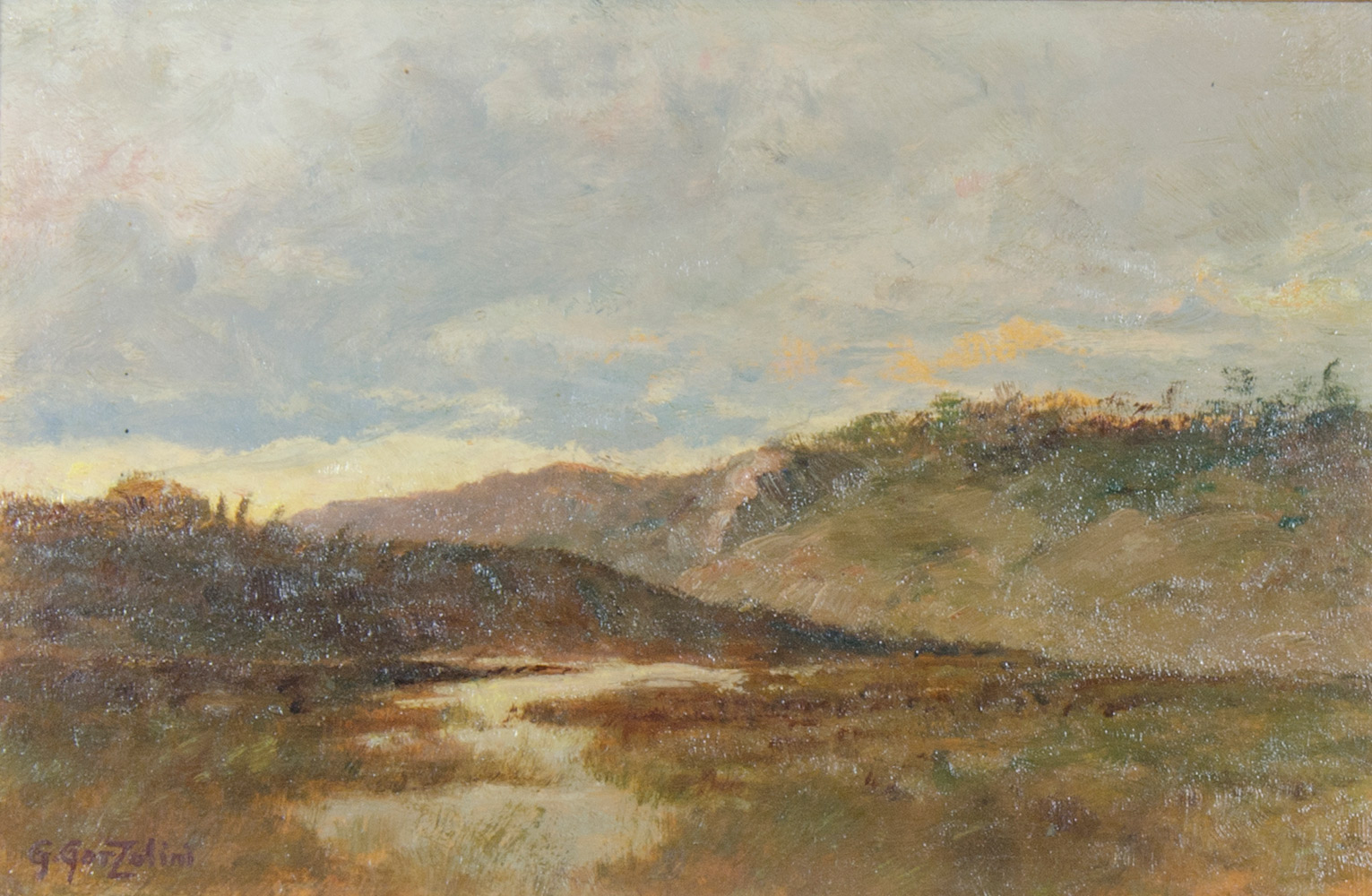 Giuseppe Garzolini Trieste 1850-1938 "Paesaggio all'imbrunire" cm. 20x30 - olio su faesite Firmato b. a s.