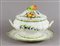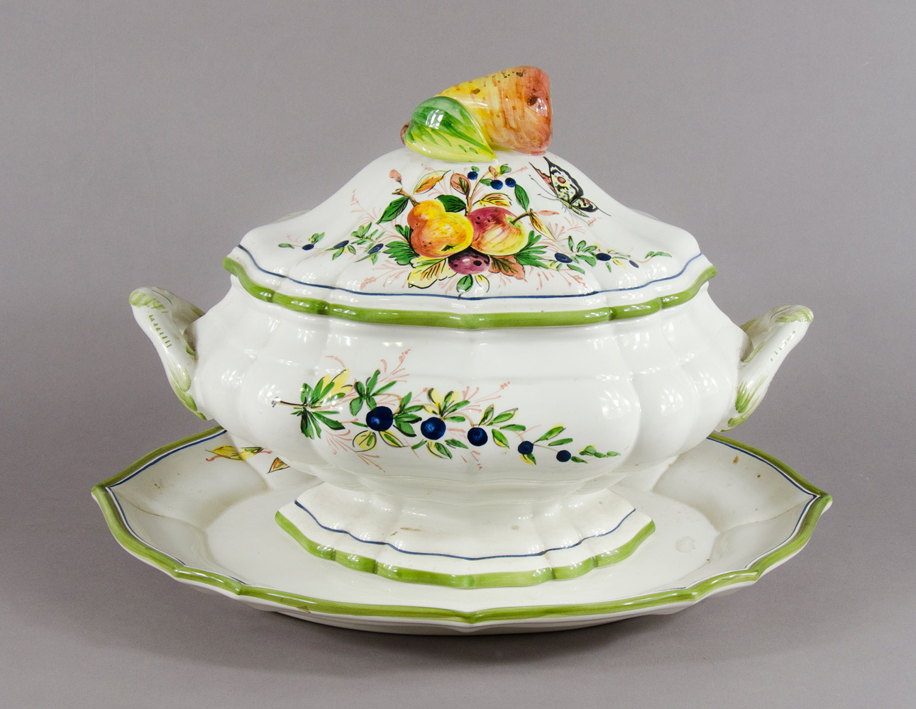 Grande zuppiera Bassano in ceramica policroma con coperchio e piatto.