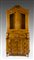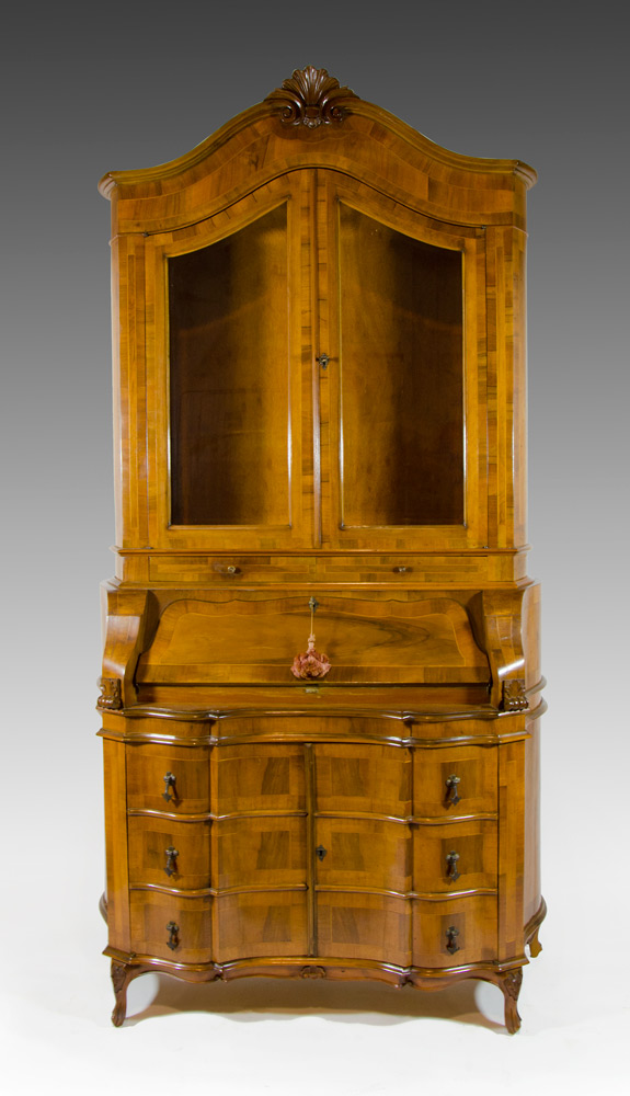 Trumeau in legno con intarsi a doppio corpo, parte inferiore a 2 ante e calatoia, parte superiore a 2 ante a vetri. cm. 232x118x50.