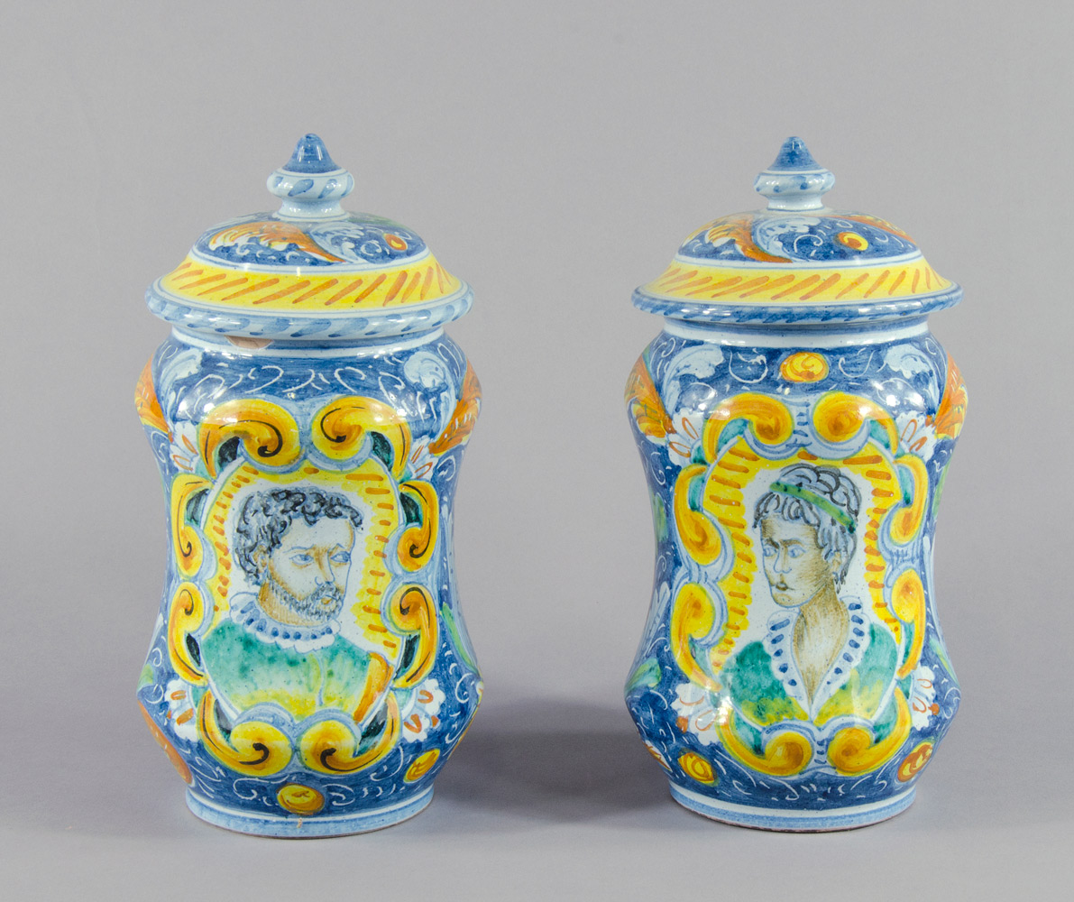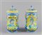 Coppia di vasi in ceramica olicroma decorato a motivi floreali e teste. H....