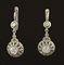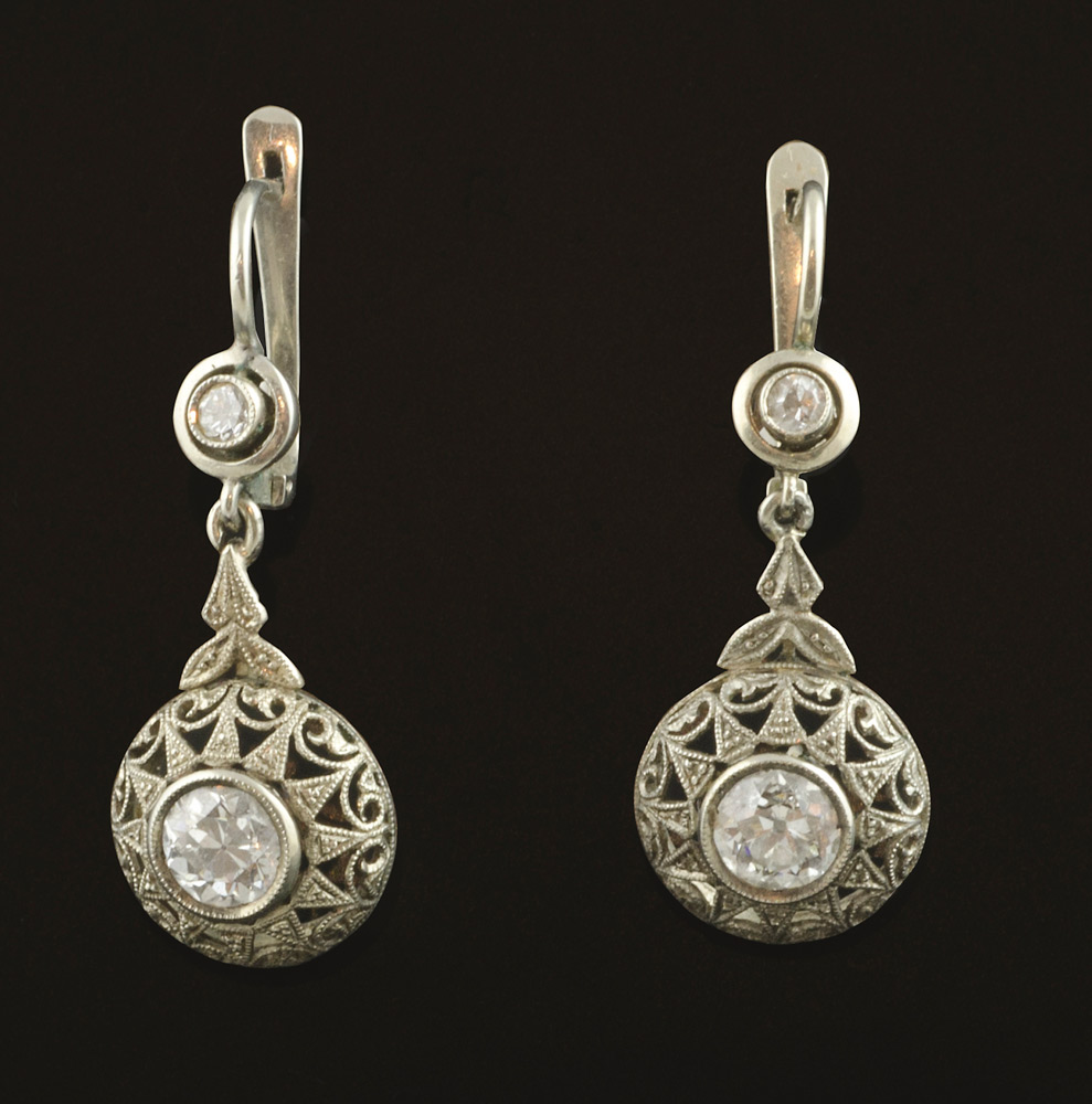 Orecchini pendenti a monachella in oro bianco , lavorazione a traforo centrati da diamanti taglio antico per ca ct tot. 1, primi 900
