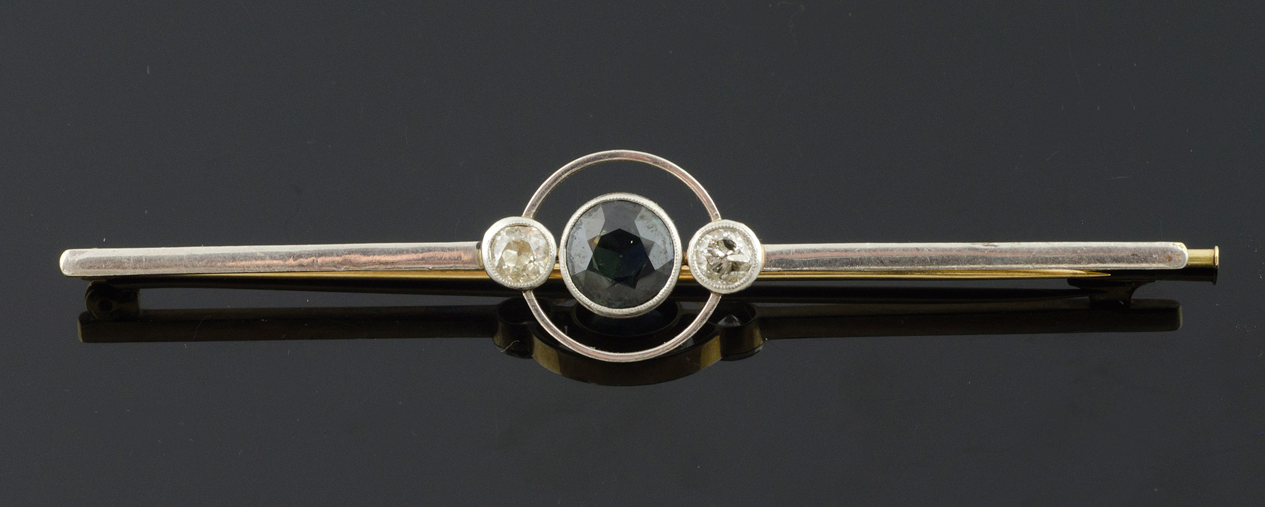 Spilla barretta in oro giallo con zaffiro al centro e ai lati due diamanti per ca ct 0,40.