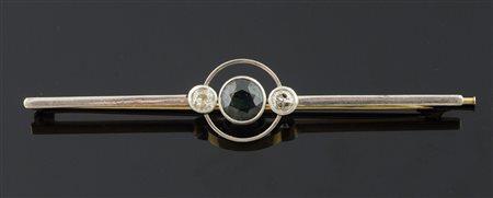 Spilla barretta in oro giallo con zaffiro al centro e ai lati due diamanti...