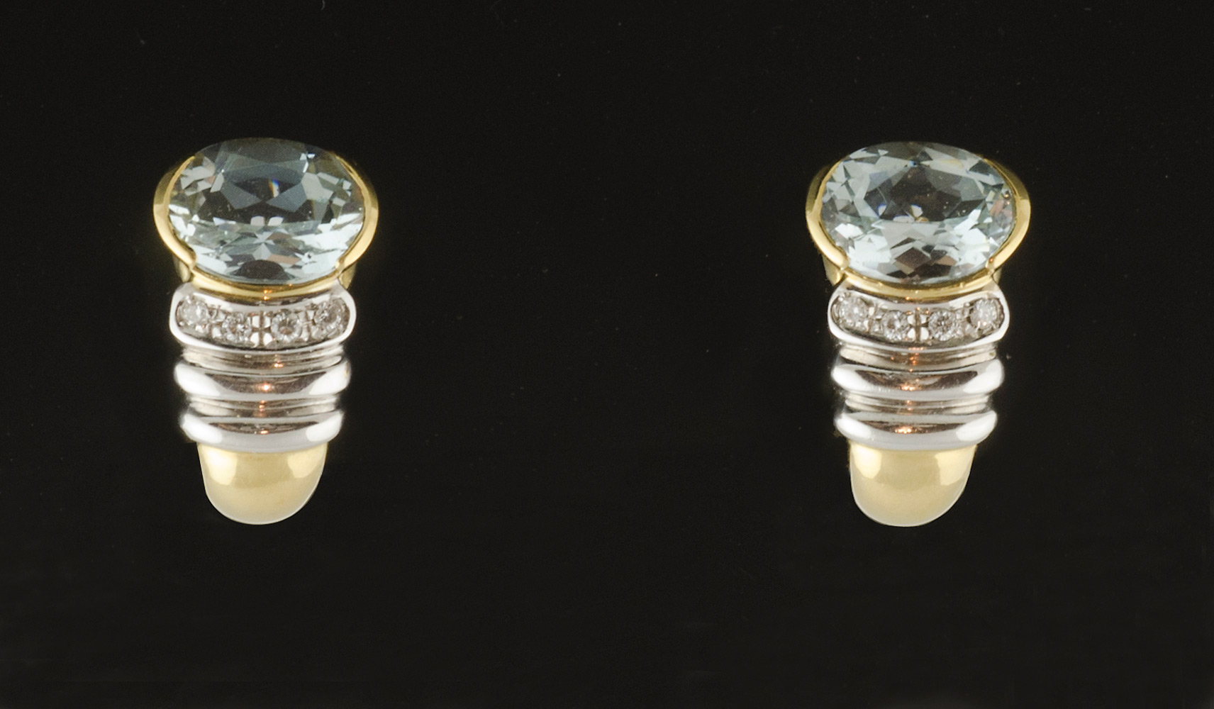 Orecchini in oro giallo e bianco con acquamarina ovale e brillantini