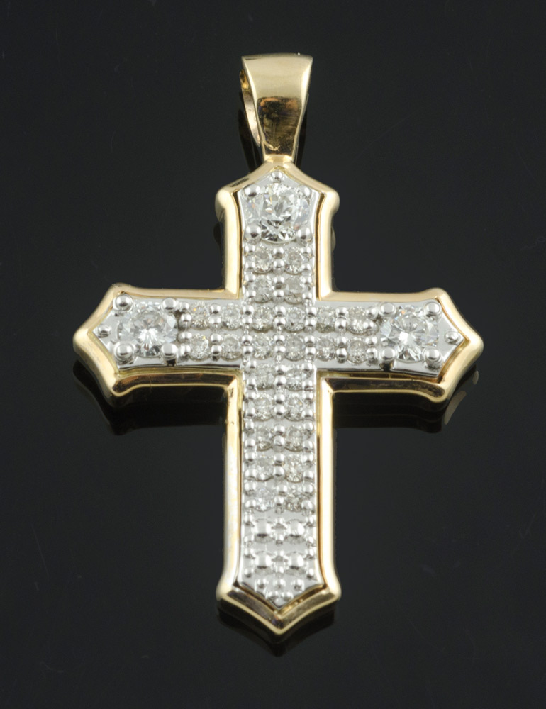 Croce in oro giallo e bianco ricoperta da piccoli diamanti, gr. 8
