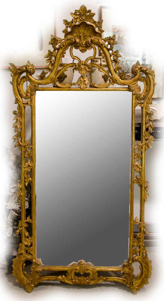 Lotto 373 | Grande specchiera in legno dorato con cimasa riccamente scolpita. cm. 168x85.