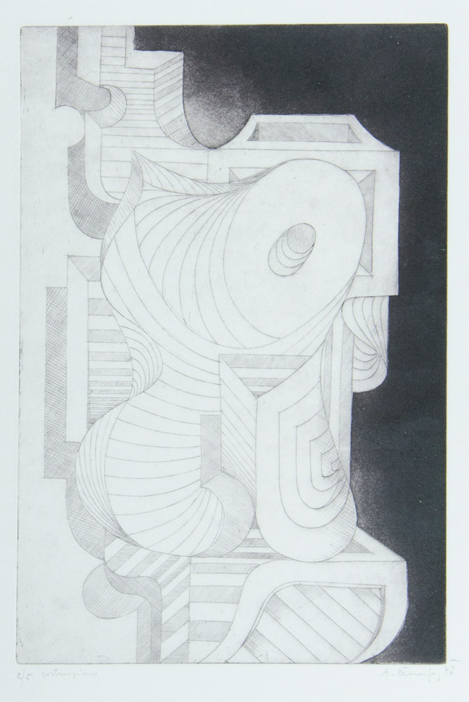 August Cernigoj Trieste 1898-Sesana 1985 "Costruzioni" cm. 36x26 - incisione Firmato b. a d. e datato '73. Esemplare 2/5.