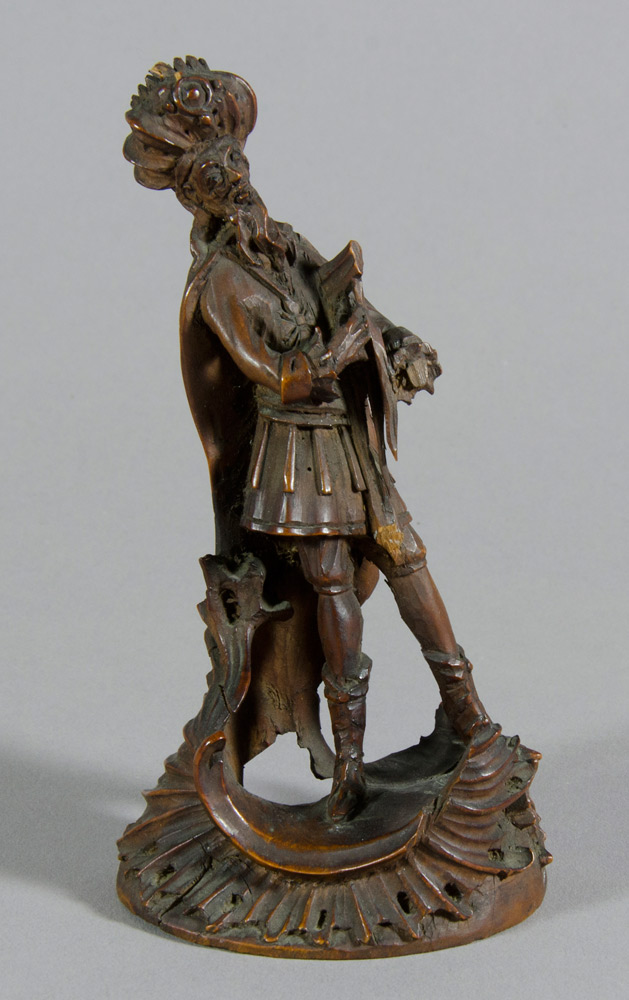Piccola scultura in legno raffigurante personaggio. Tirolo, XVIII secolo. H. cm. 13,5.