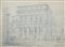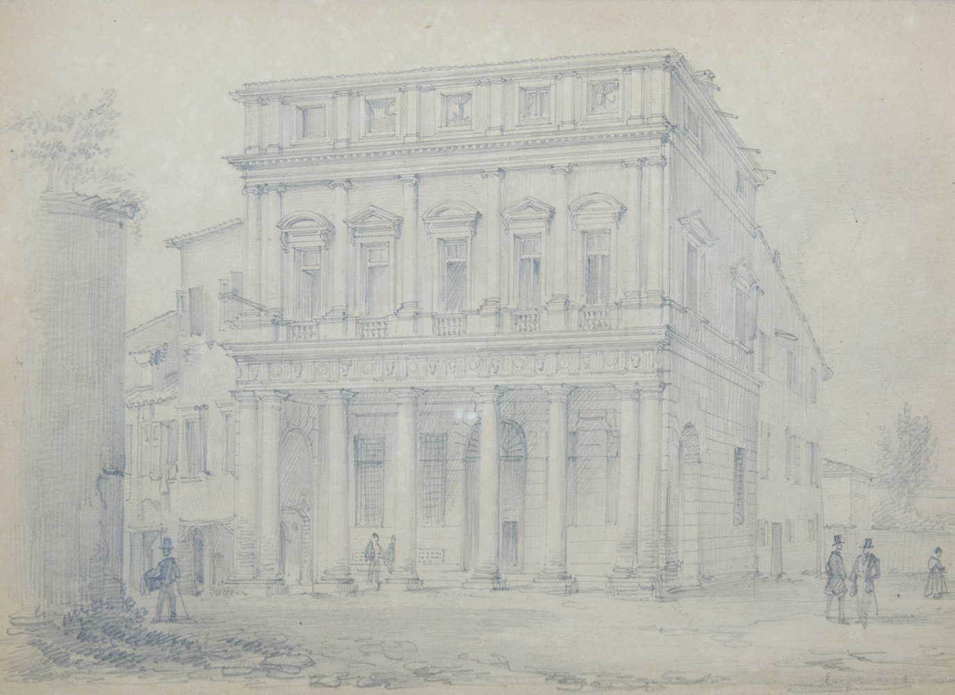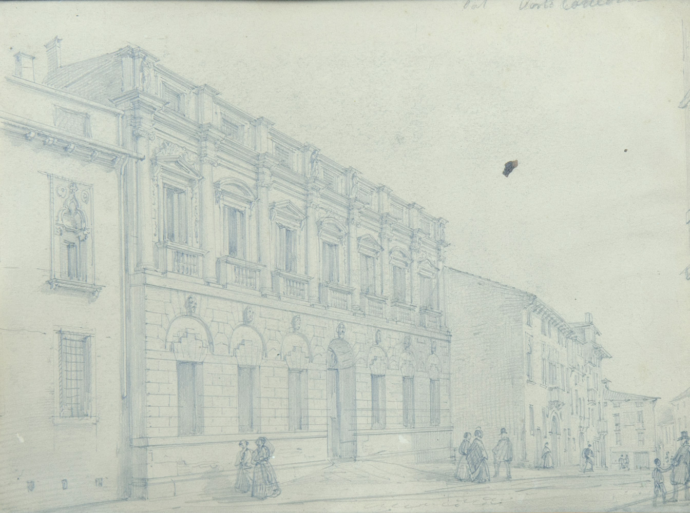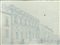 Lotto di 2 disegni a matita raffiguranti vedute di palazzi, incorniciati.