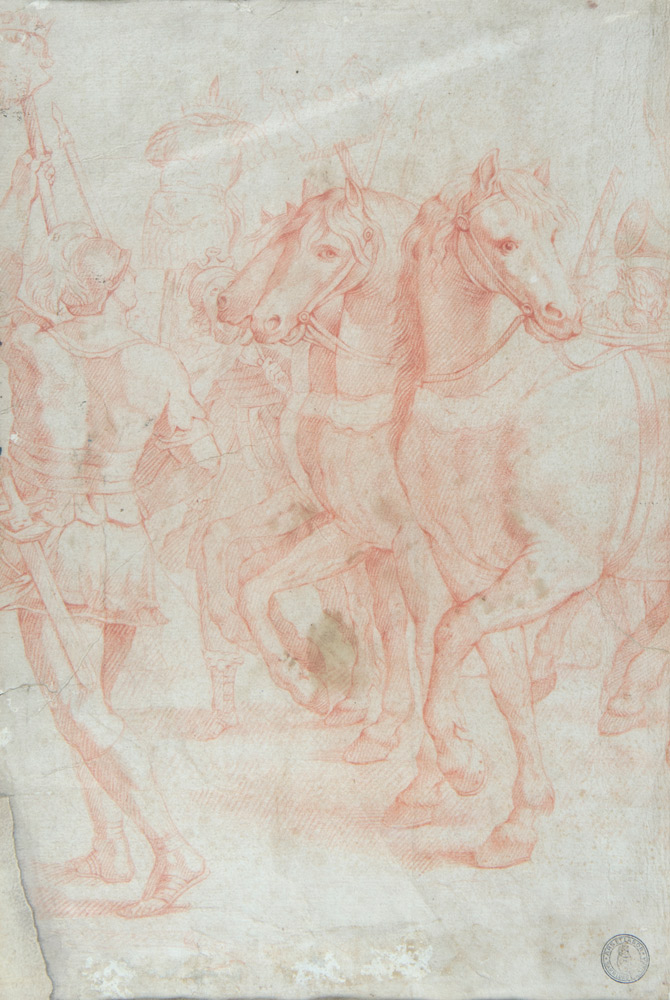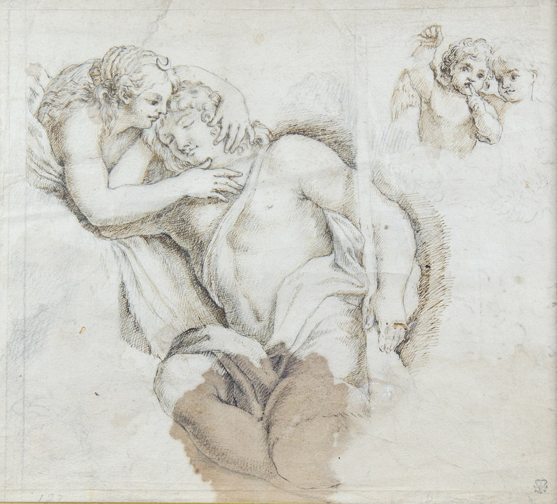 Maestro del XVII secolo Lotto di 2 disegni incorniciati raffiguranti cavalli e Adone, misure diverse.
