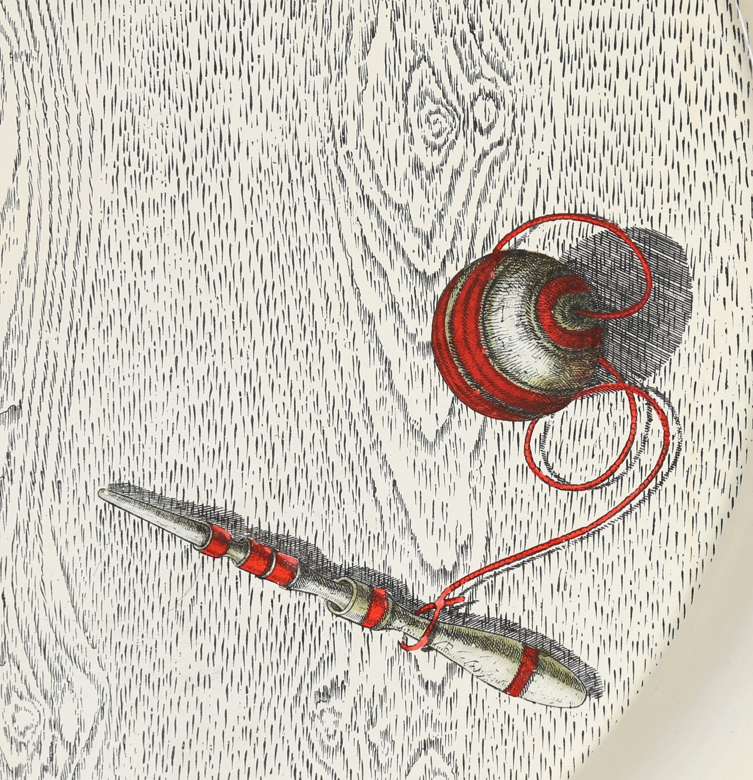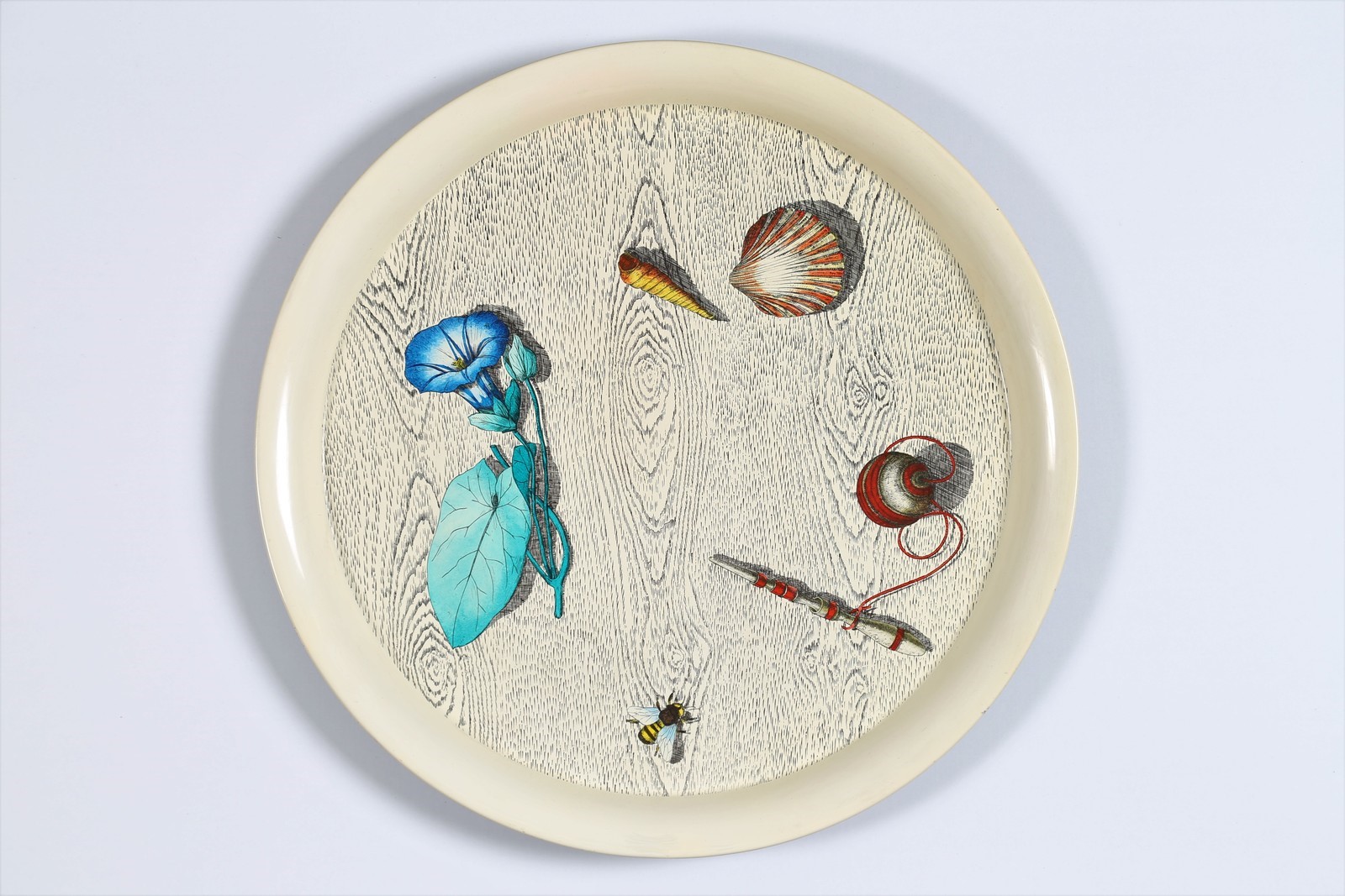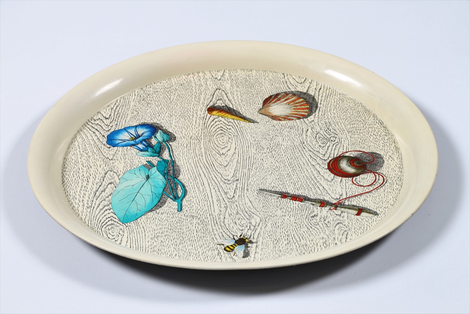 FORNASETTI PIERO (1913 - 1988) Vassoio in metallo laccato e decorato, anni 50. Etichetta presente. -. Cm 60,00 x 3,50.