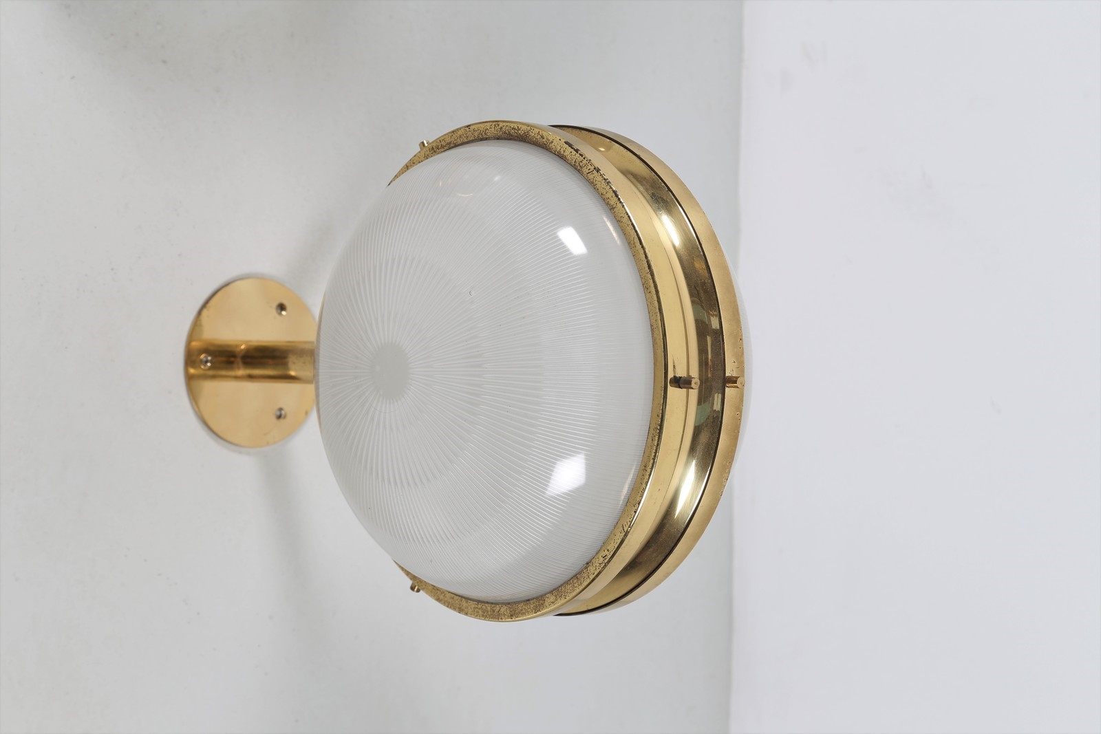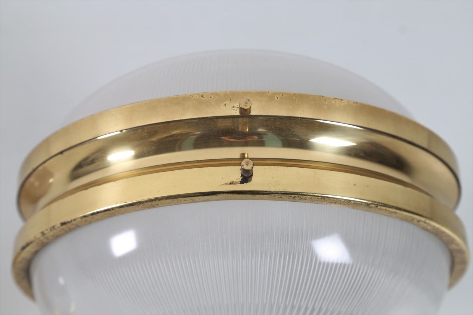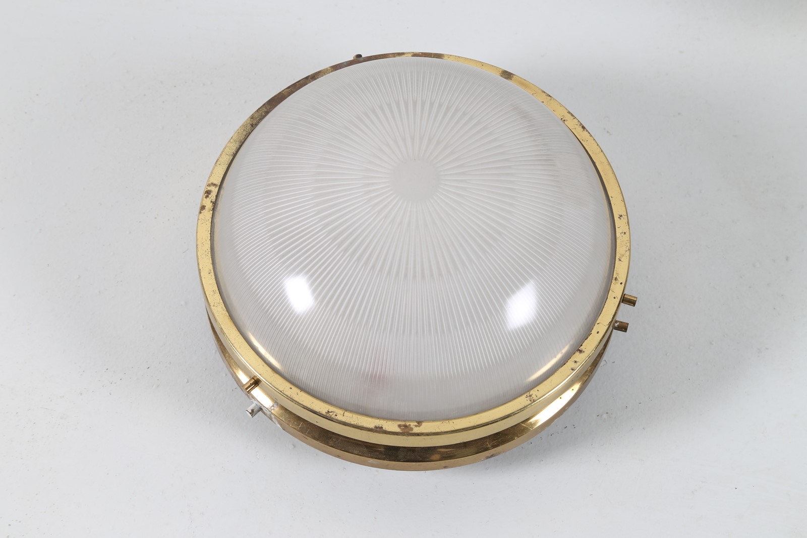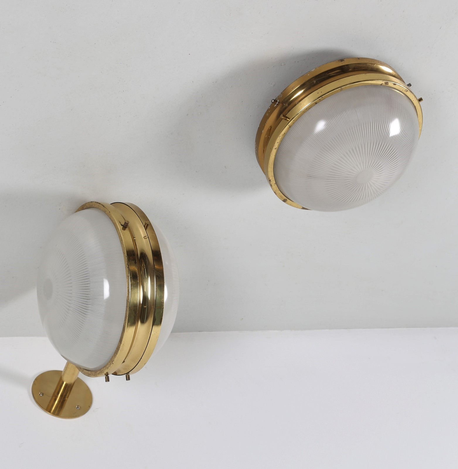 MAZZA SERGIO (n. 1931) Due lampade soffitto e parete in ottone e cristallo pressato, mod. Gamma/C per ARTEMIDE, 1960. Pubblicazioni; Domus num. 366 maggio 1960 pag. 46; Catalogo Artemide 1969, pag. 41. . . . Misura applique: H 26 L 20 P 38 Misura plafoniera: H 15 L 26 P 26