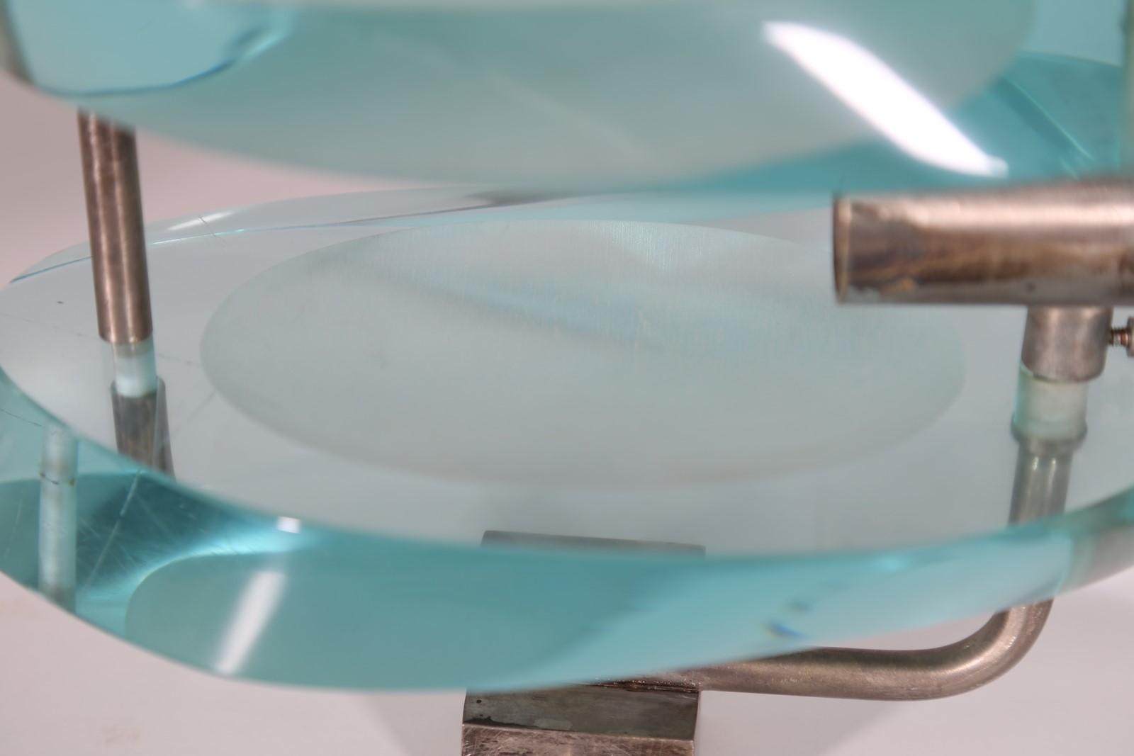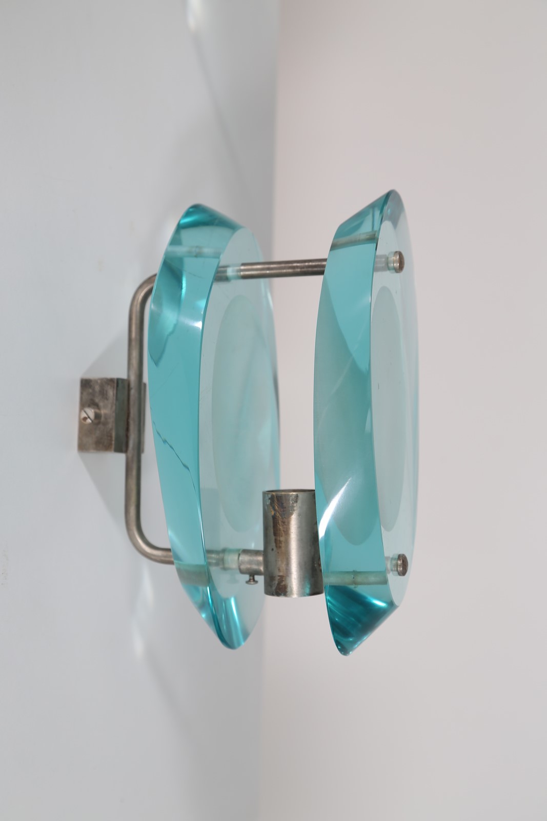 INGRAND MAX (1908 - 1969) Coppia di lampade da muro in ottone nichelato e cristallo molato colore azzurro, mod. 2093, per Fontana Arte. Pubblicazioni; Catalogo originale Fontana Arte . -. Cm 11,00 x 21,00 x 15,50.