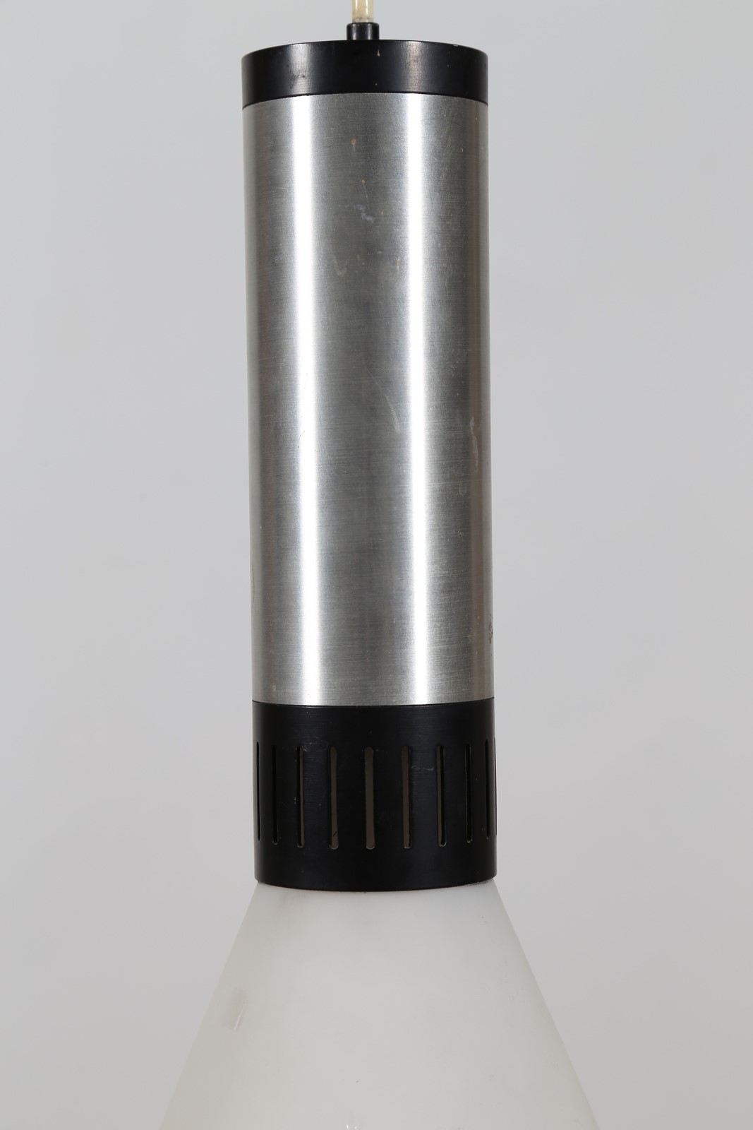 STILNOVO Lampada a sospensione in alluminio e vetro satinato, anni 50. Etichetta presente. -. Cm 20,00 x 110,00 x 20,00.