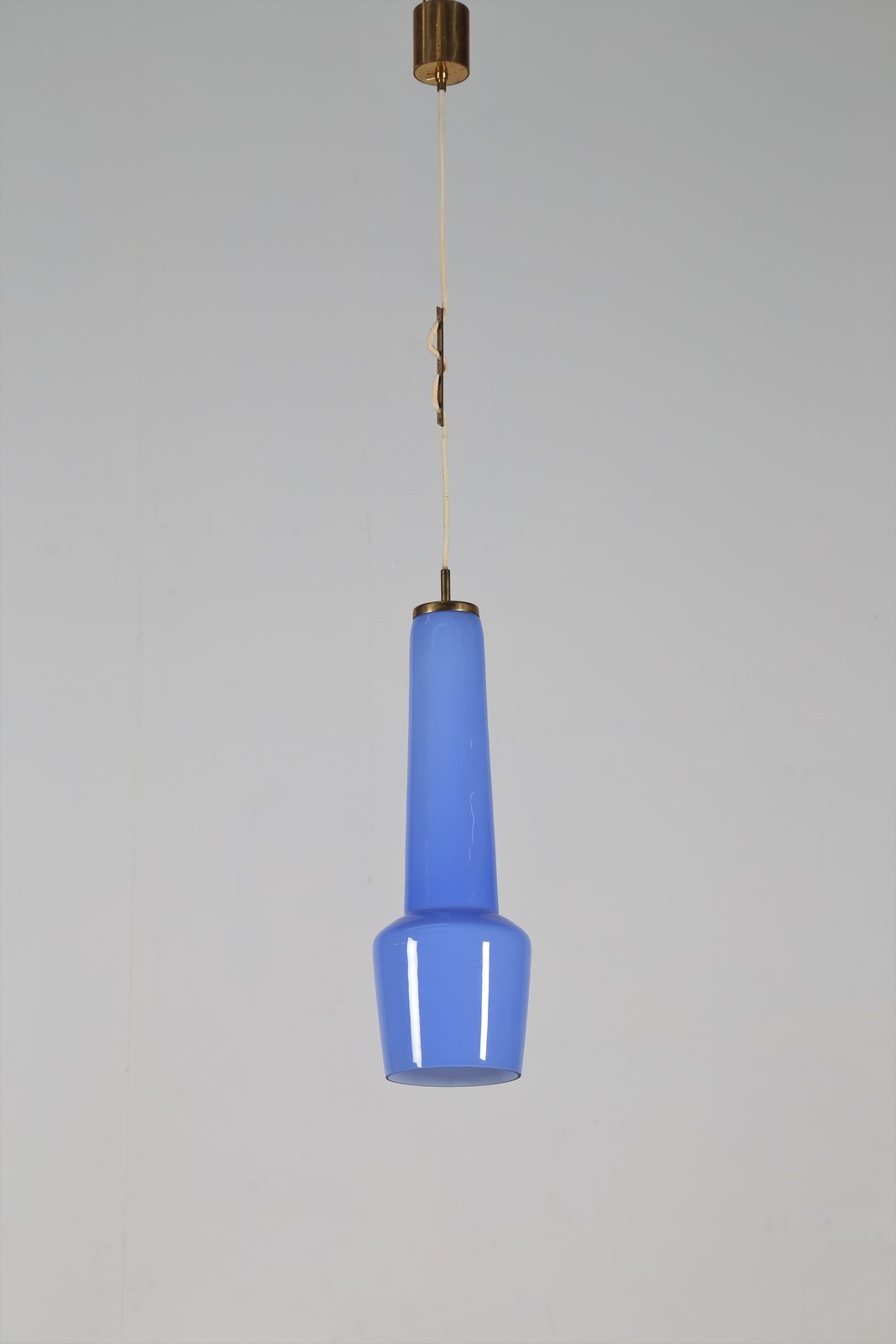 STILNOVO Lampada a sospensione in ottone e vetro incamiciato, anni 60....