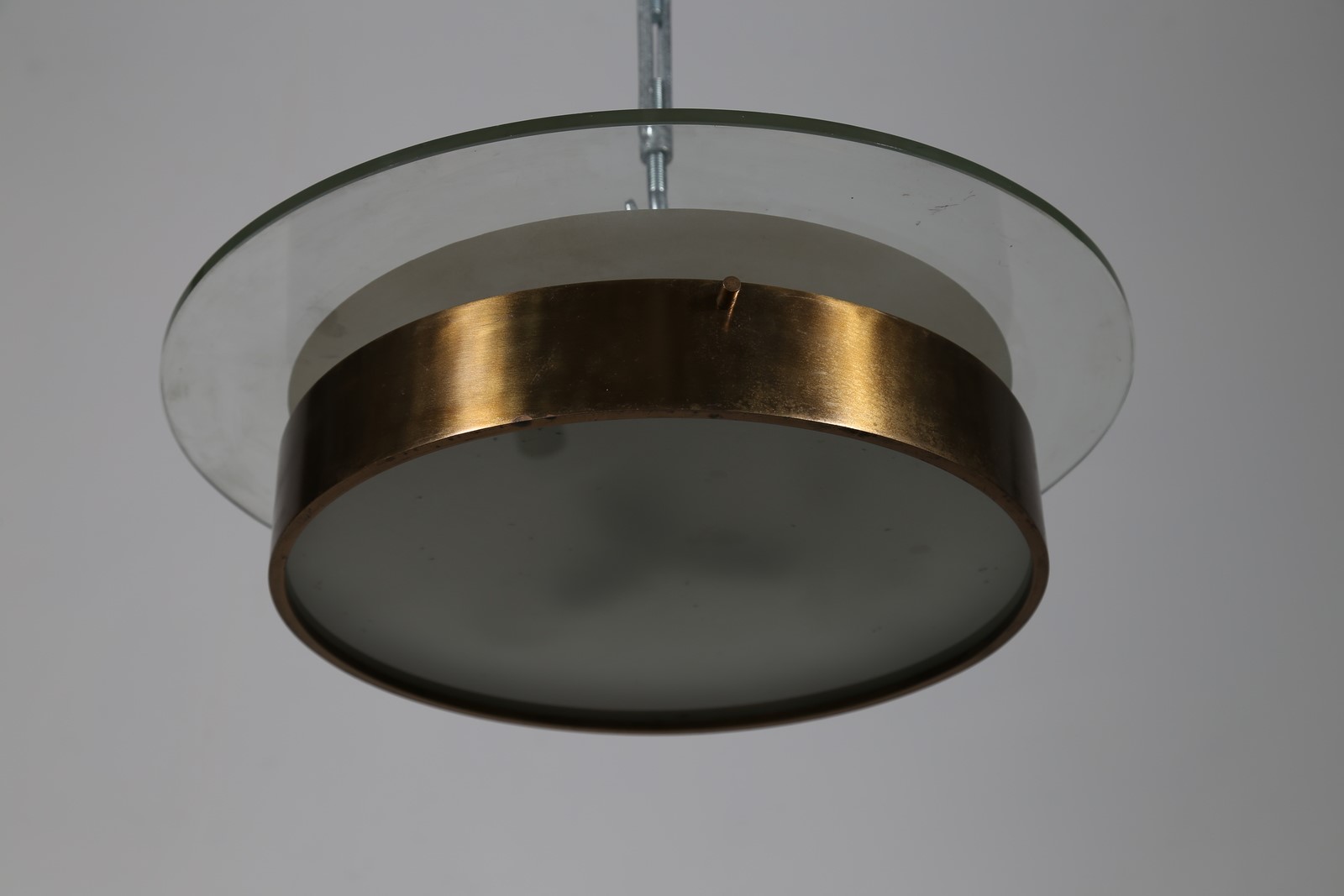 STILNOVO Grande plafoniera in ottone metallo laccato cristallo e vetro satinato, anni 50 . . Cm 50,00 x 15,00.