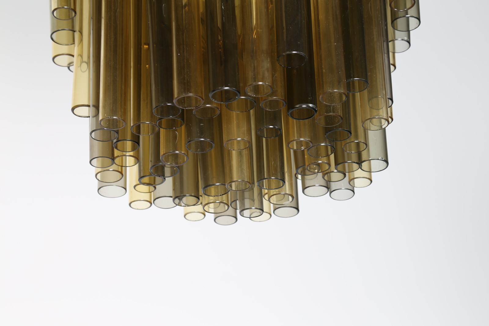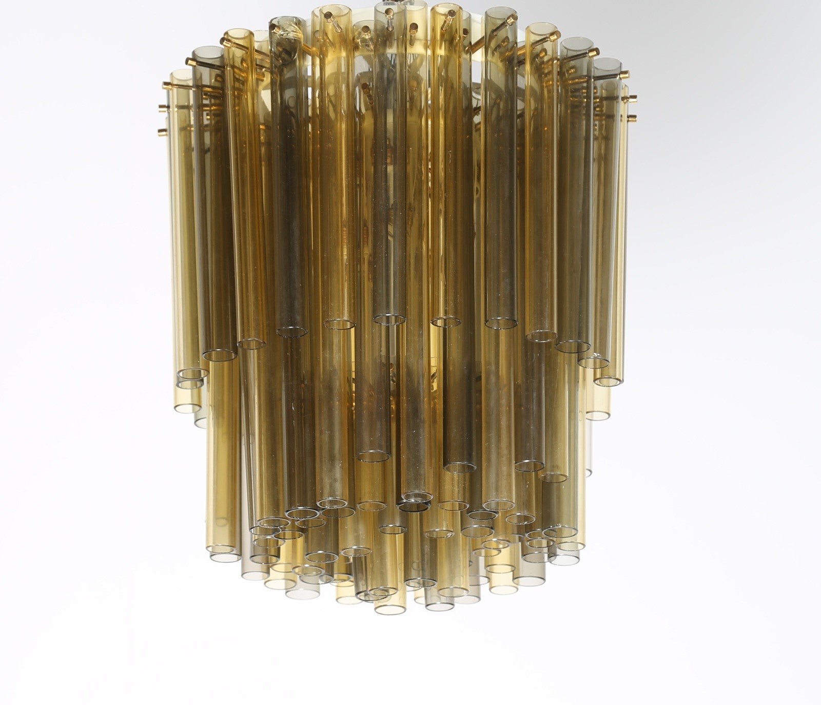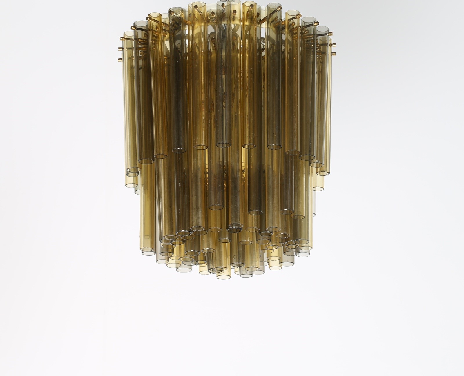VENINI Lampada a sospensione in metallo ottone e vetri tubolari, anni 50. -....