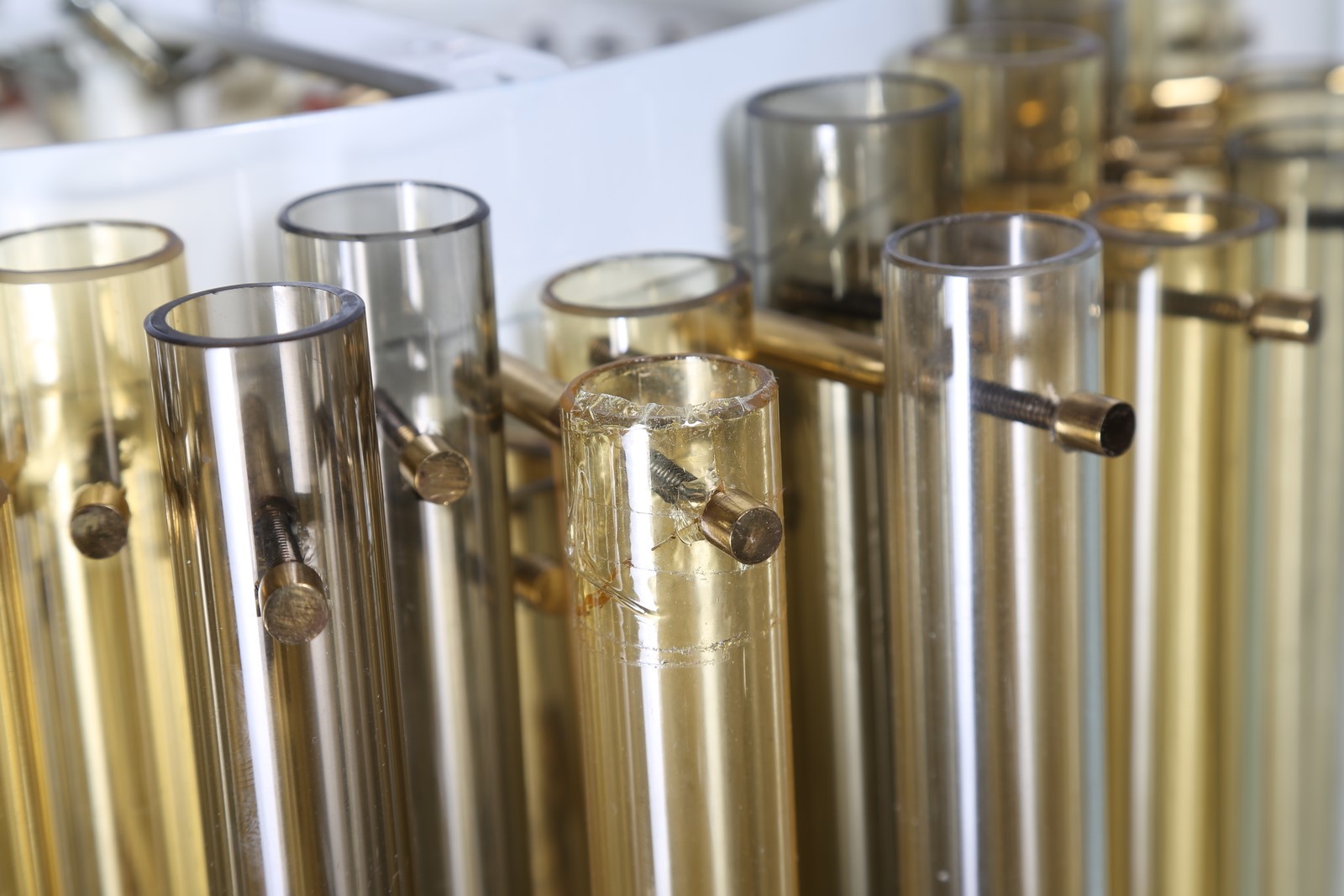 VENINI Lampada a sospensione in metallo ottone e vetri tubolari, anni 50. -. Cm 48,00 x 55,00 x 48,00. presenti felature su alcuni vetri