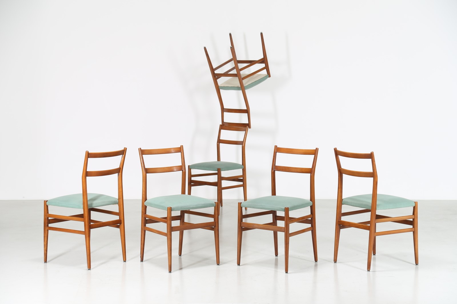 PONTI GIO' (1891 - 1979) Sei sedie in faggio e tessuto mod. leggera,...