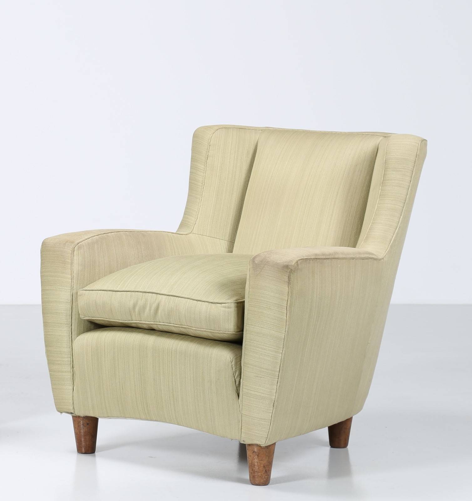 TEMPESTINI MAURIZIO (1908 - 1960) Attrib. Coppia poltrone in legno e tessuto, anni 40 . -. Cm 87,00 x 88,00 x 87,00.