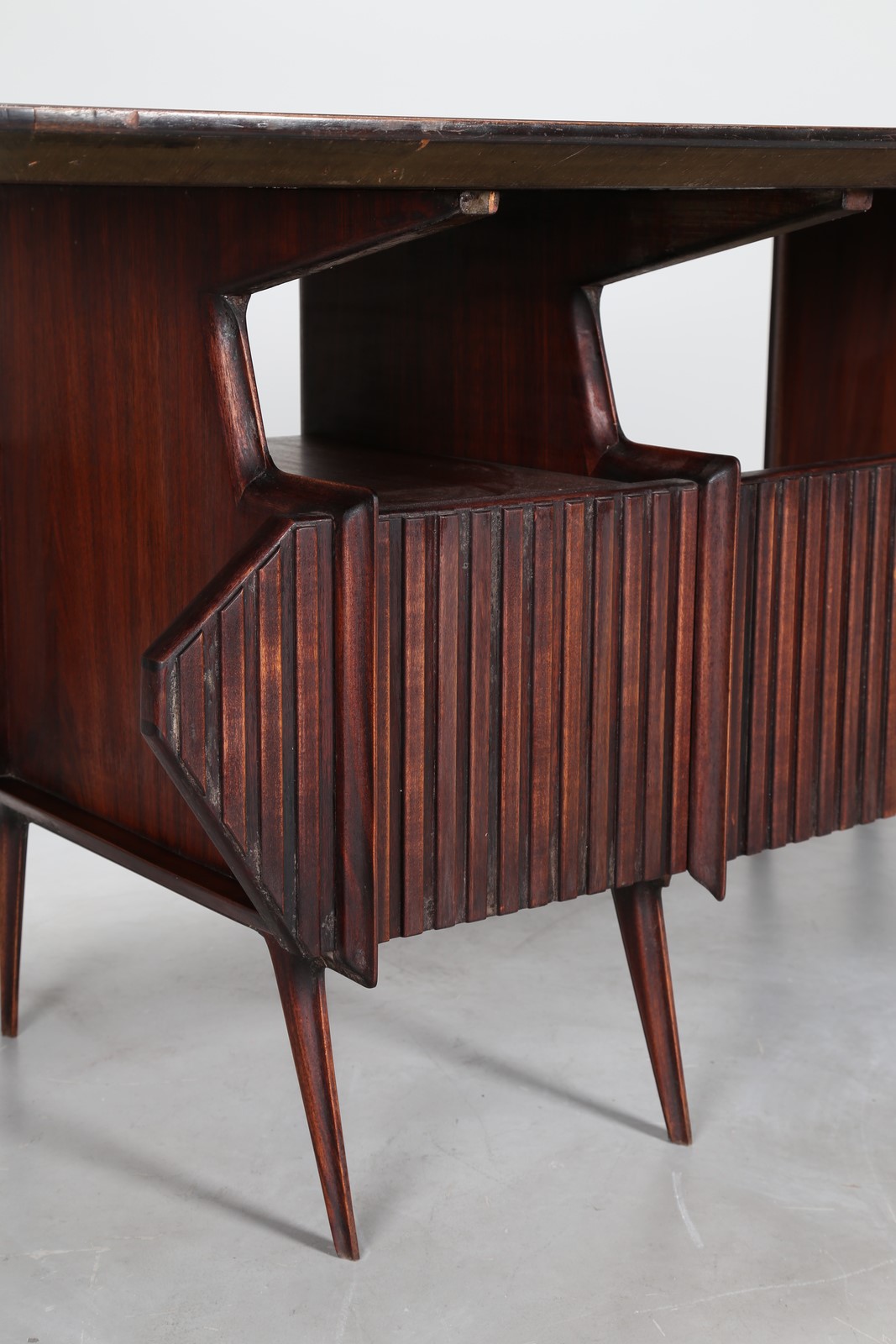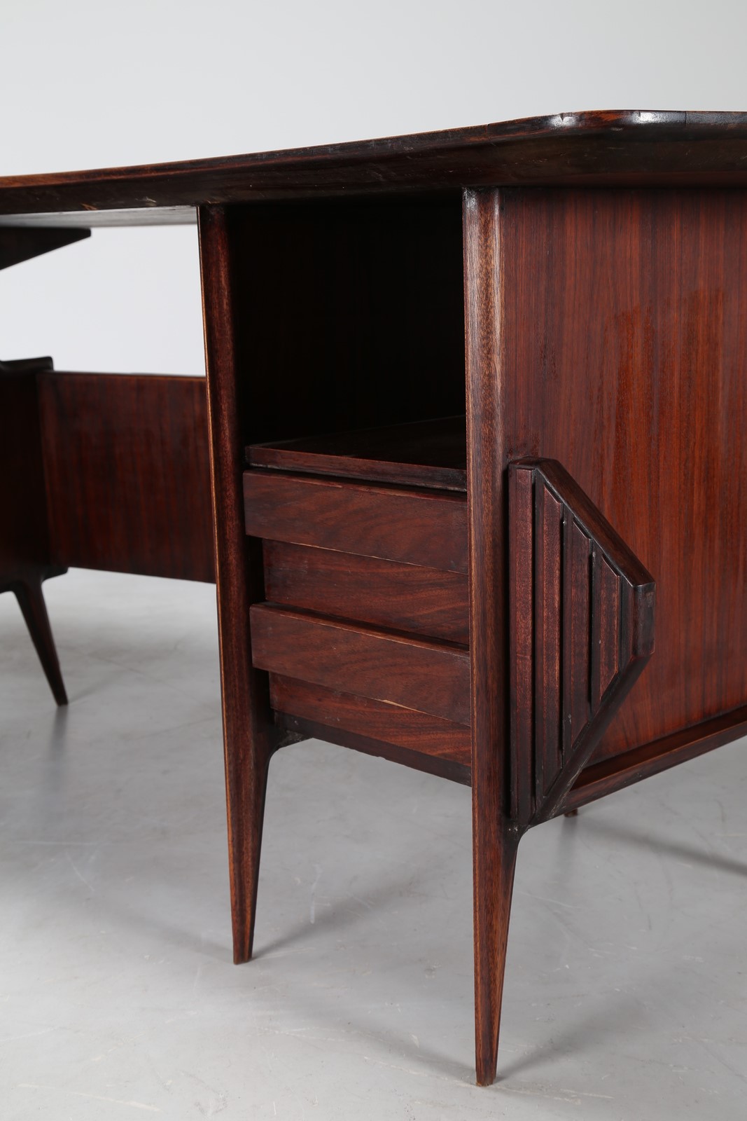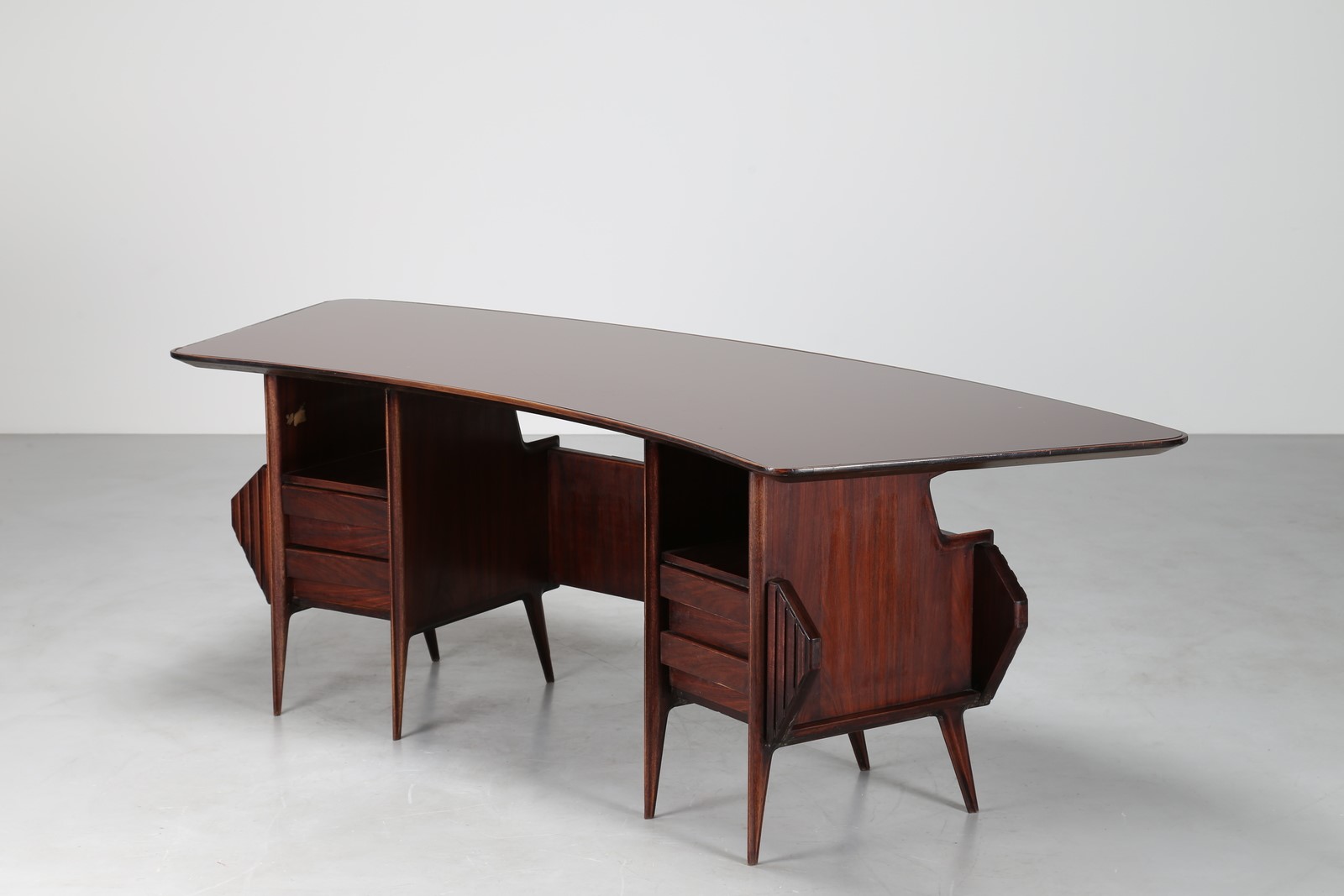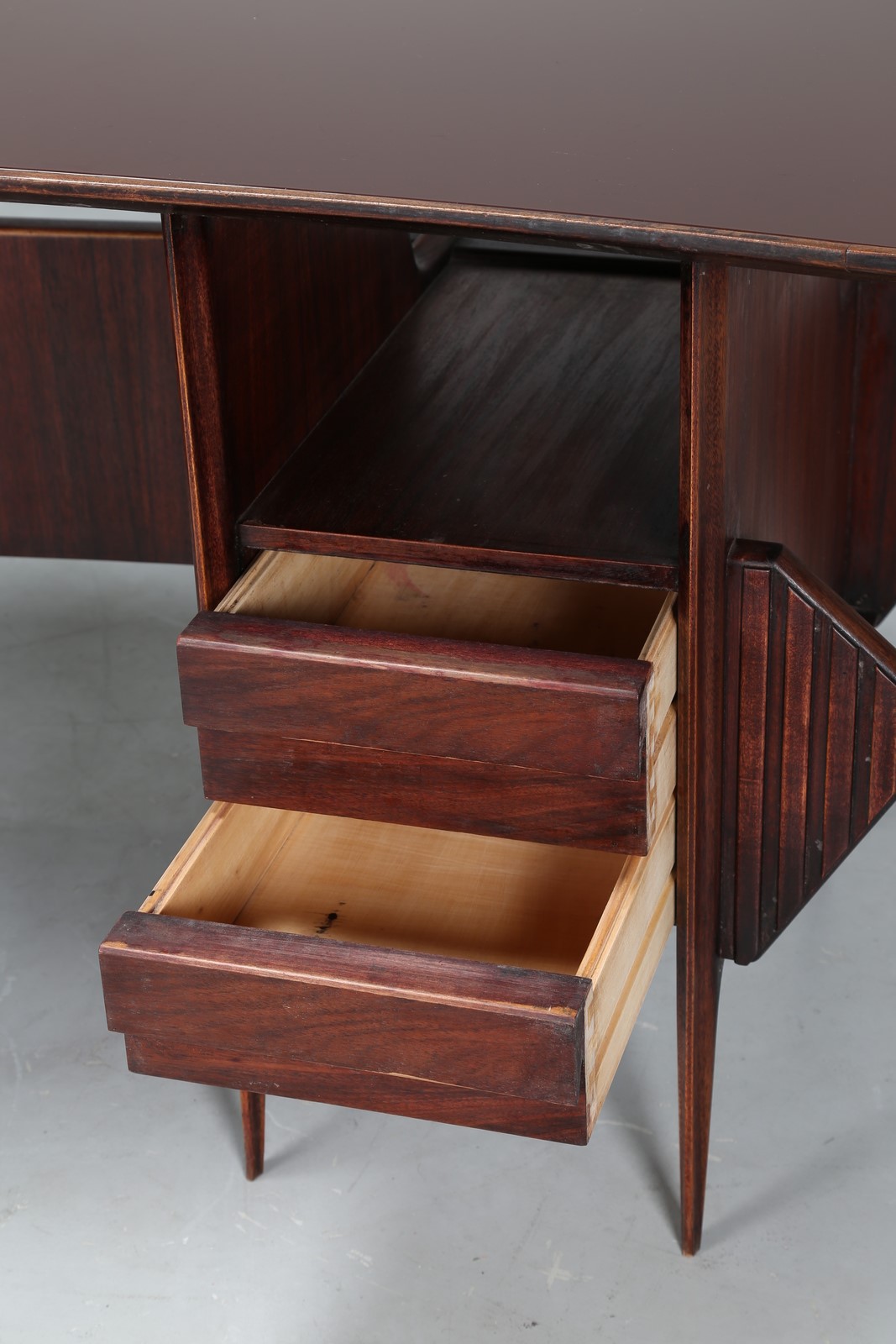 GOTTARDI MARIO Attrib. Scrivania a mezza luna in palissandro con piano in vetro, esecuzione Ebanisteria Brianzola, anni 50. . Cm 240,00 x 79,00 x 89,00.