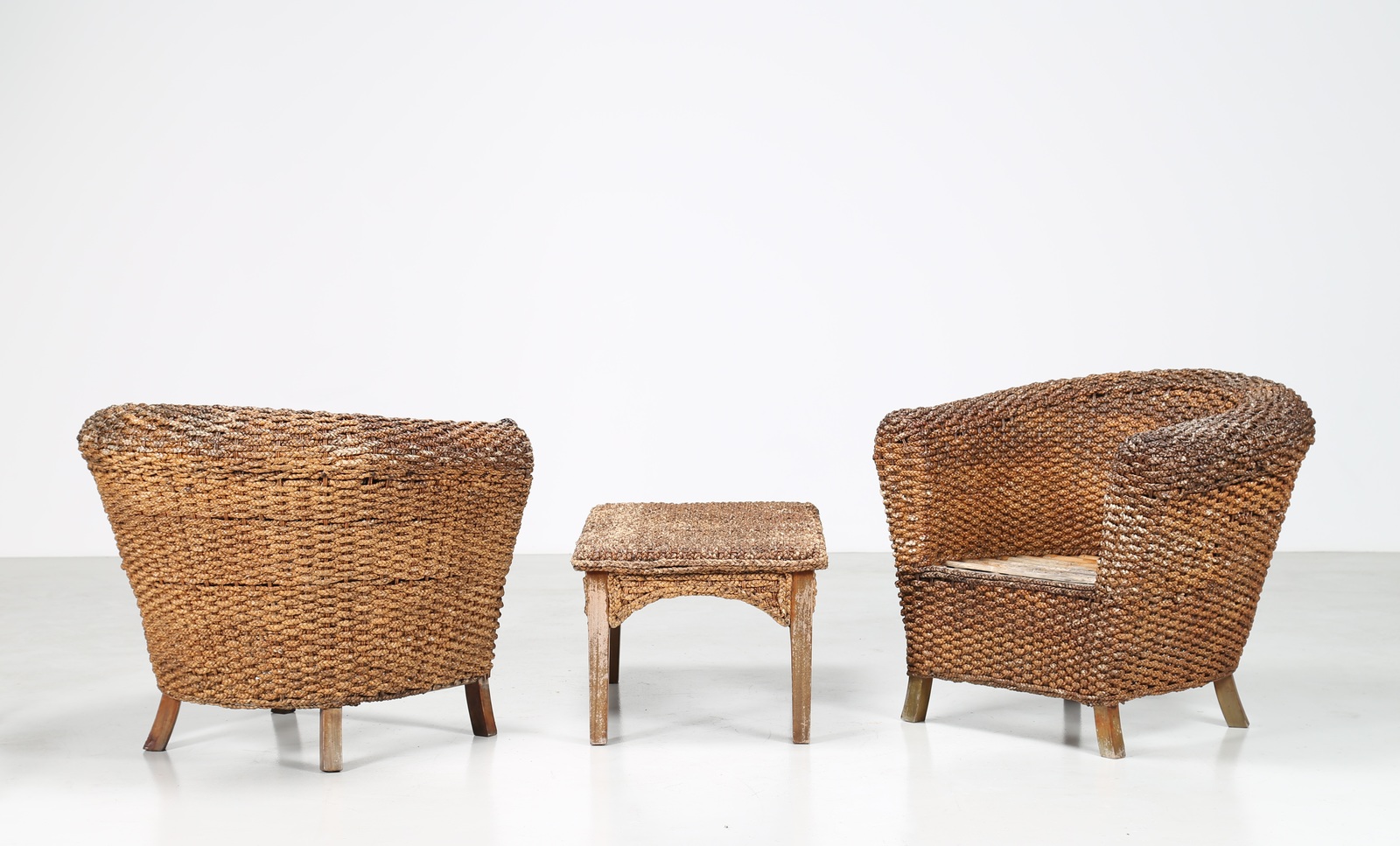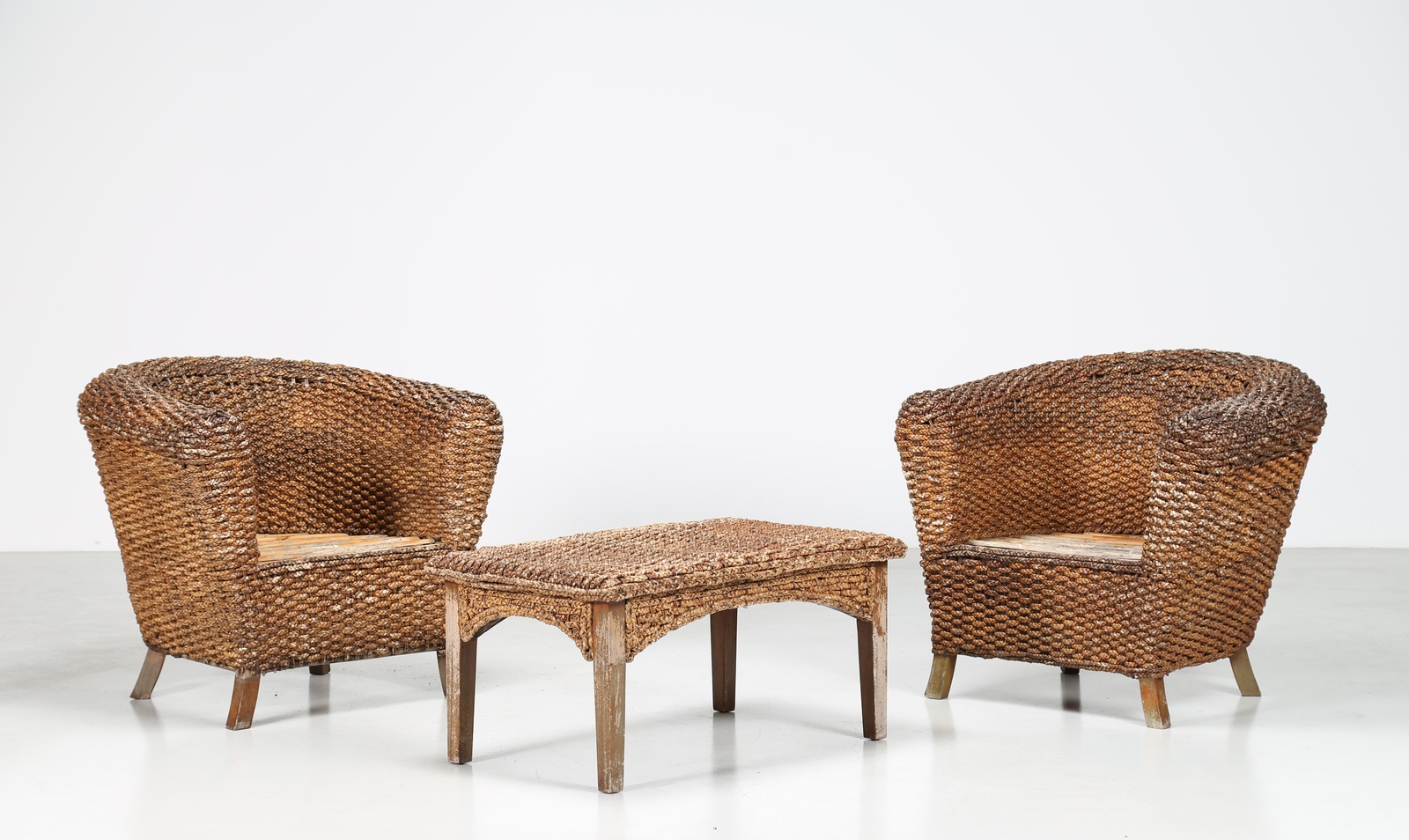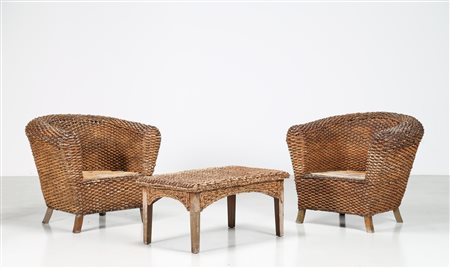 MANIFATTURA ITALIANA Coppia di poltrone e tavolino in canna d'india...