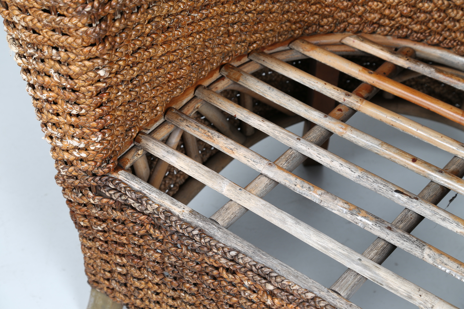 MANIFATTURA ITALIANA Coppia di poltrone e tavolino in canna d'india intrecciata e bambu'. -. Cm 90,00 x 80,00 x 81,00. Misura tavolino: H 45 L 93 P 58
