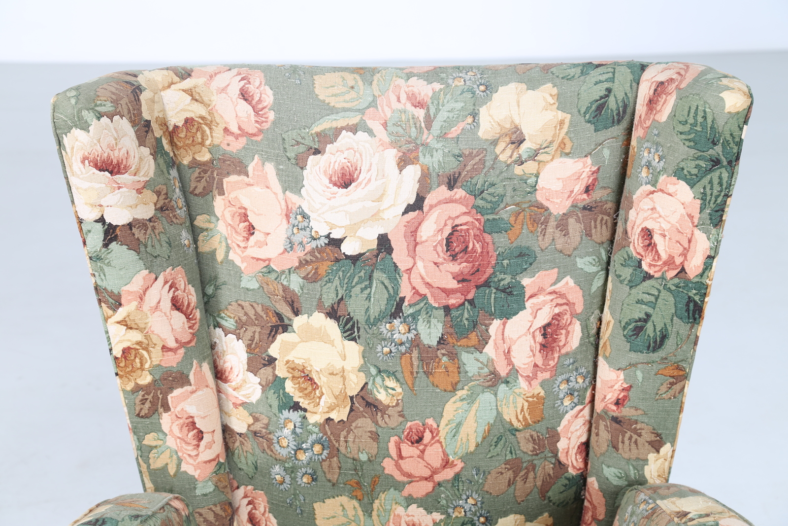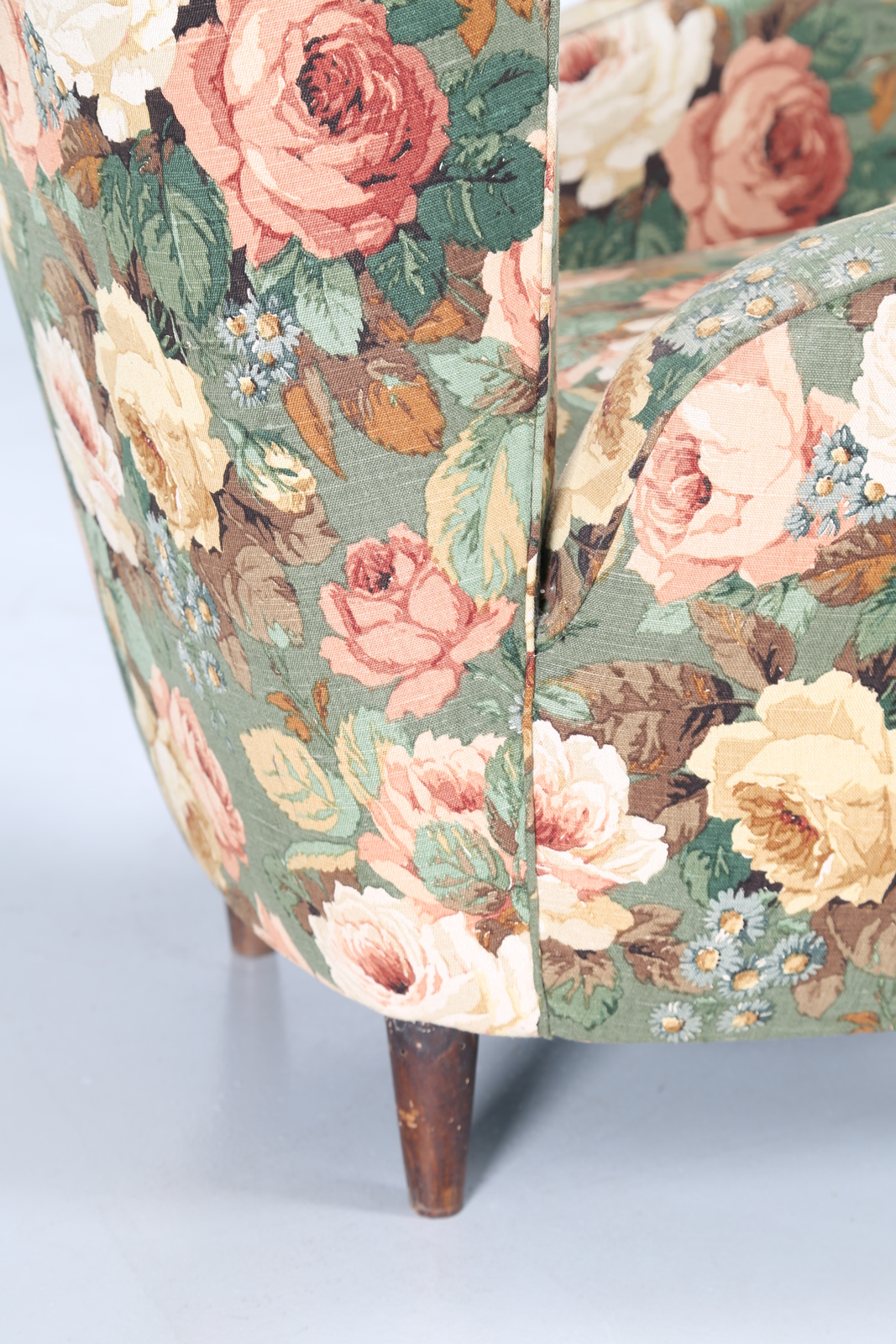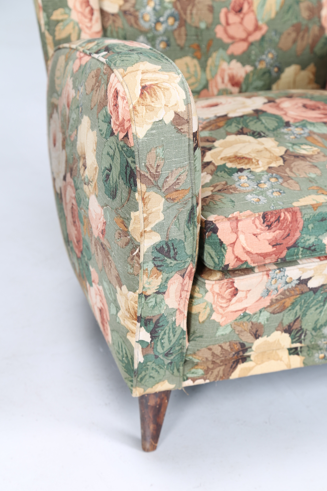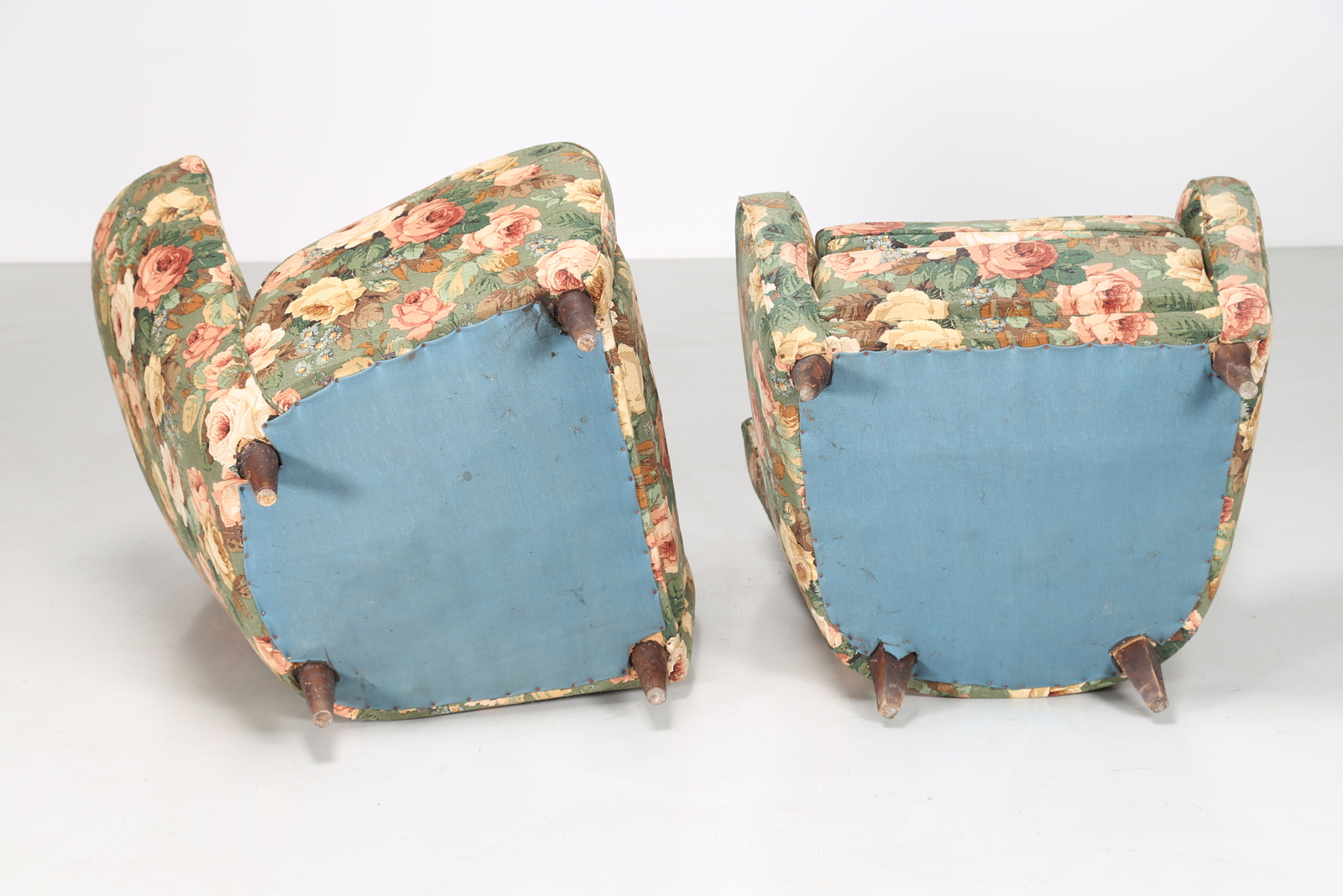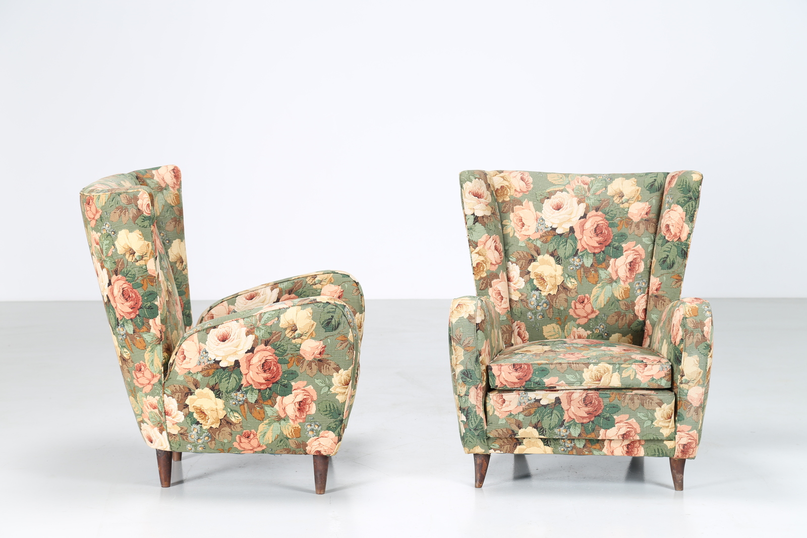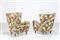 MANIFATTURA ITALIANA Coppia di poltrone in tessuto floreale e legno, anni 50. -. Cm 75,00 x 89,00 x 80,00. Anni'60.