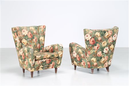 MANIFATTURA ITALIANA Coppia di poltrone in tessuto floreale e legno, anni 50....