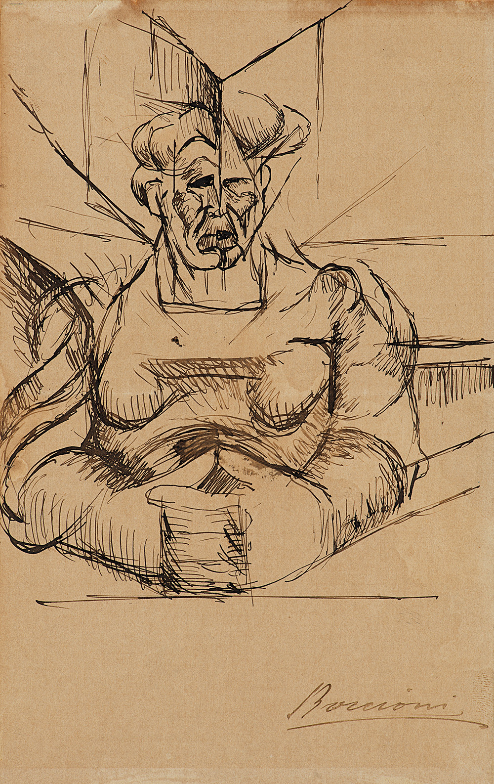 UMBERTO BOCCIONI (1982 - 1916) Studio per Testa + casa + luce (La madre),1912 penna su carta, cm 21,4x13,6 Milano, collezione Ruberl Ambroso. Reggio Calabria, Museo Nazionale, Omaggio a Boccioni, a cura di G. Ballo 21 giugno - 21 ottobre 1966, riprodotto n.45, (etichetta al verso) (illustrato n.45); Genova, Palazzo dell'Accademia, Opere grafiche di Umberto Boccioni, (a cura di G. Bruno) 16 novembre-15 dicembre 1968, n. 48; Newcastle, Hatton Gallery, Exhibition of Italian Futurism (1909 - 1919), 4 novembre - 9 dicembre 1972 (etichetta al verso) Edimburgo, Royal Scottish Academy, Exhibition of Italian Futurism (1909 - 1919), 17 dicembre 1972 - 14 gennaio 1973 (etichetta al verso); Milano, Palazzo Reale, Boccioni a Milano, dicembre 1982 - marzo 1983, n. 77 p. 246 (illustrato, titolato La madre. Studio per Volumi orizzontali; Hannover, Kunstmuseum Hannover mit Sammlung Sprengel, Boccioni und Mailand, 19 maggio - 14 agosto 1983 (etichetta al verso) Monaco, Museum Villa Stuck, Boccioni und Mailand, 6 ottobre - 18 dicembre 1983 (etichetta al verso). M. Calvesi, A. Dambruoso, Boccioni, Catalogo generale, Allemandi edizioni, Torino 2016, ripr. tav. 414, pp. 338 e 152; L. Mattioli Rossi, Boccioni?s Materia: a futurist masterpiece and the avant-garde in Milan and Paris, New York Guggenheim Museum 2004, ripr. fig. 33 p. 40 (La madre); M. Calvesi, E. Coen, Boccioni, l'opera completa, Electa, Milano 1983, ripr. n. 756, p.422 (La madre, 22 x 14 cm ); G. Ballo, Boccioni - La vita e l'opera, Il Saggiatore, Milano 1982, n.214, tav. 461, ripr. (Studio per volumi orizzontali, 1912- la madre); A,Palazzeschi, G. Bruno, L'opera completa di Boccioni, Rizzoli editore, Milano 1969, ripr. tav. 148b p. 107; G. Ballo, Omaggio a Boccioni, catalogo della mostra, Maestri Arti Grafiche, Milano 1966, ripr.; G. Ballo, Boccioni - La vita e l'opera, Il Saggiatore, Milano 1964, ripr. 243, p. 358 tav. n.461 (La madre - Studio per volumi orizzontali); M. Drudi Gambillo, T. Fiori, Archivi del futurismo 2, De Luca edizioni, Roma 1962, ripr. n. 260 (La madre - studio per Materia 21.5 x 35 cm); J. C. Taylor, The graphic work of Umberto Boccioni, New York, Museum of modern art, Dubleday, 1961, n. 228 (Study for 'Materia'- non illustrato). UMBERTO BOCCIONI (1982 - 1916) Studio per Testa + casa + luce (La madre),1912 pen on paper, cm 21,4x13,6 PROVENANCE: Milan, Ruberl Ambroso collection.