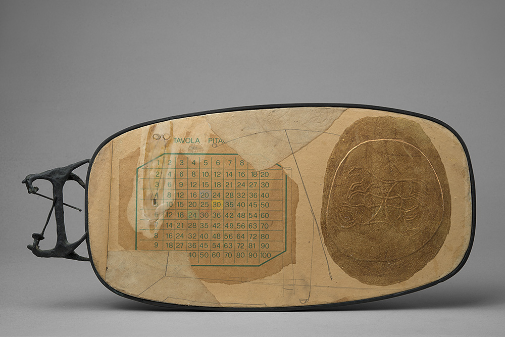 bronzo, collage e tecnica mista su tela applicata su tavola, cm 18x38,8