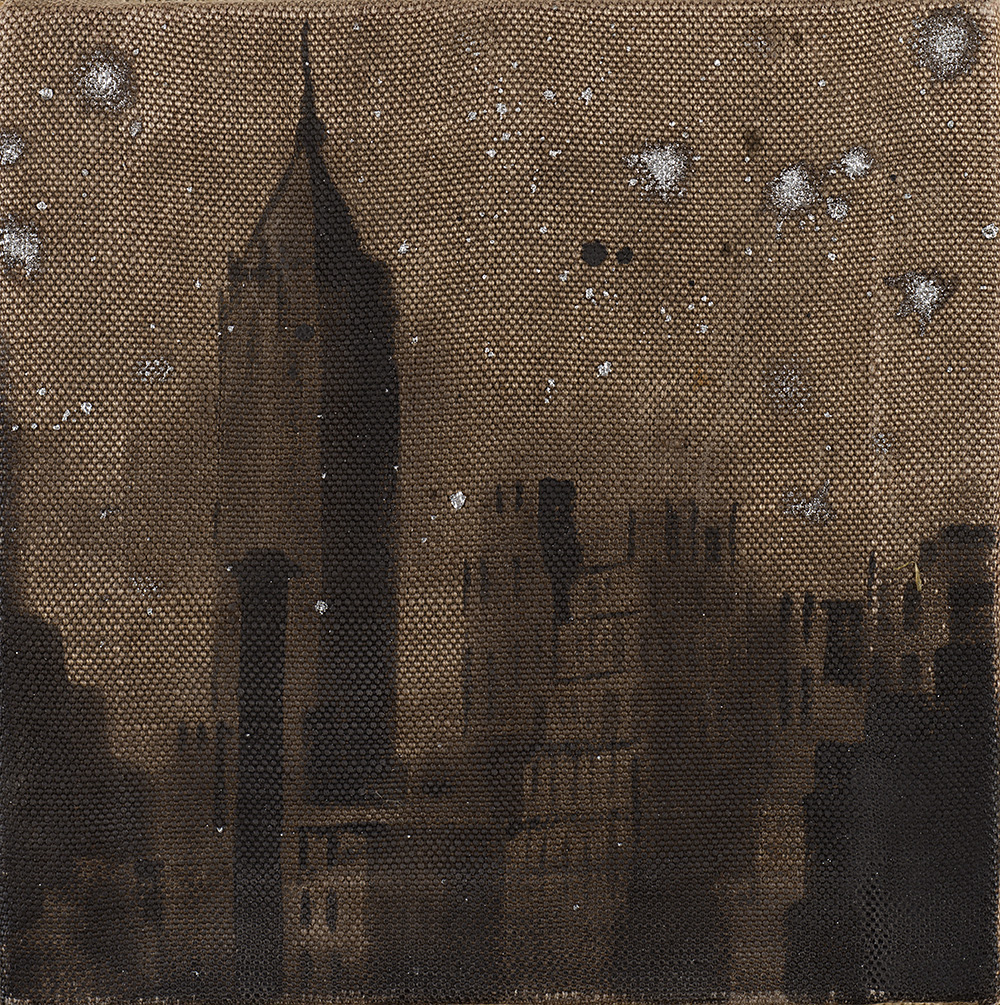 colori acrilici, polvere d'alluminio su telone ferroviario, cm 20x20