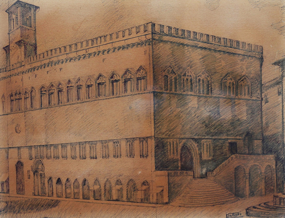 Gerardo Dottori (Perugia 1884 – Perugia 1977) Palazzo dei Priori di Perugia anni 30' Tecnica mista su cartoncino dim. 34X49 Firmato in basso a dx L'Opera è stata autenticata dallo stesso Dottori con una dichiarazione autografa sul verso di una polaroid Pubblicata a pagina 807 del II volume del Catalogo Generale Opere di Dottori