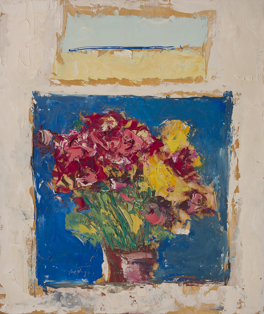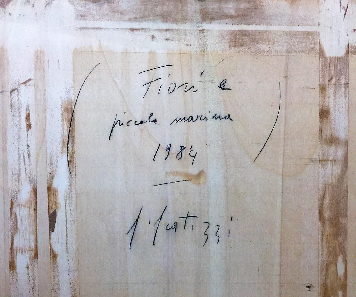 Sergio Scatizzi (Capannori 1918 – Firenze 2009) Fiori e piccola marina 1984 Olio su tavola dim. 100X86 Firmato in basso a sx Al verso titolo data e Firma Autentica su foto dell'Artista Acquistato dall'Artista Opera senza cornice