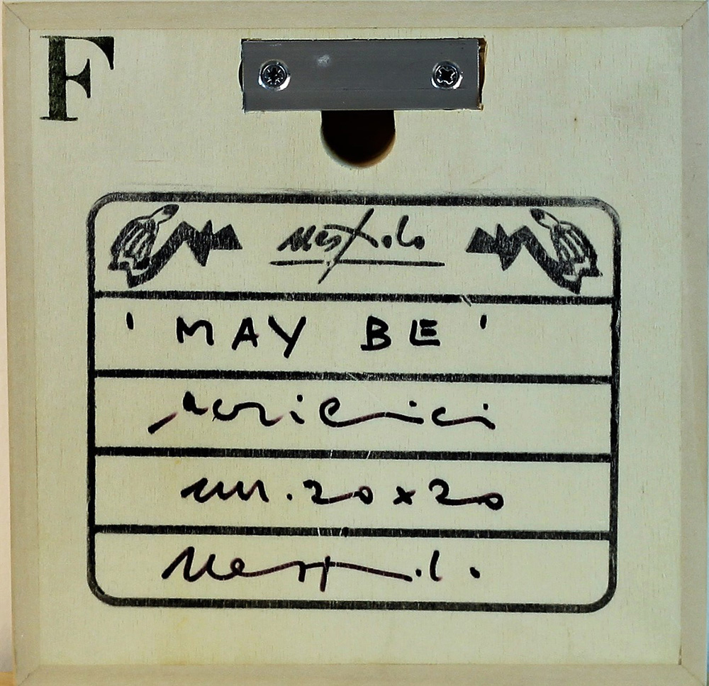 Ugo Nespolo (Mosso 1941) May Be Acrilici e intarsi su tavola dim. 20X20 Firmato in basso a dx Al verso Titolo, misure, Archivio Ugo Nespolo Autentica su foto dell'Artista