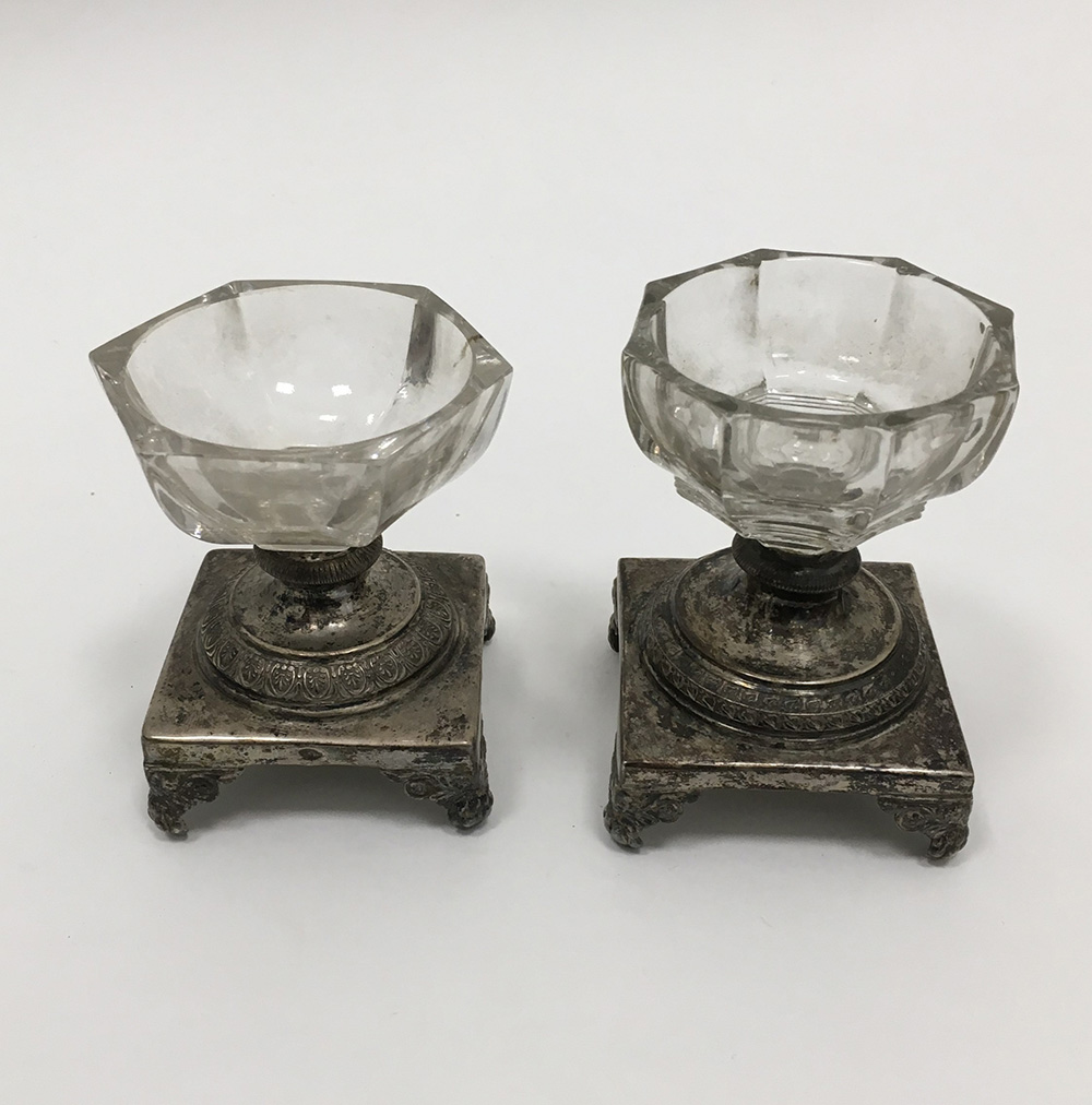 Due saliere similari con base in argento e contenitore esagonale in vetro. Regno di Sardegna, Zecca di Genova, 1825-73 (h. max cm 9,5 ca.) (lievi difetti)