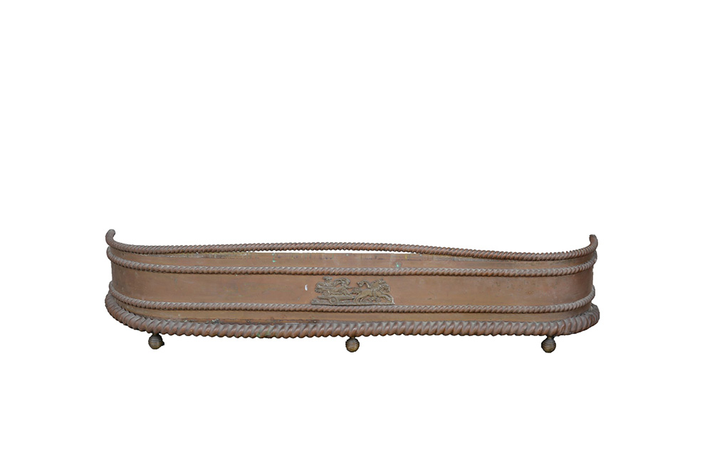 Parafuoco da camino in rame con profili cordonati, decorato al centro da placca (l cm 128) sec XIX (difetti)