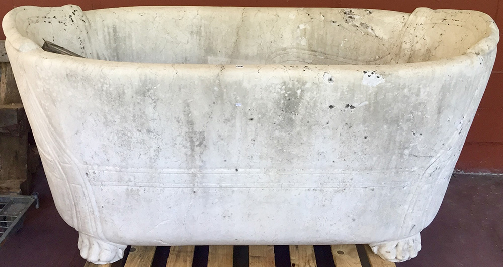 Vasca "Impero" in marmo con fianchi scolpiti ad imitare una sedia e una poltrona, piedi a zampa ferina. Sec. XIX (cm 180x90x90) (difetti)