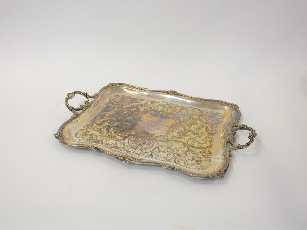 Vassoio in metallo argentato, a due manici, di forma rettangolare sagomata e fondo inciso a girali fogliati (cm 60x41 ca.) (difetti)