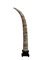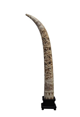 Grande scultura composta da numerosi piccoli tasselli in avorio ed altri materiali a forma di zanna decorata con guerrieri a cavallo con dettagli a colori, base in legno (lievi difetti)