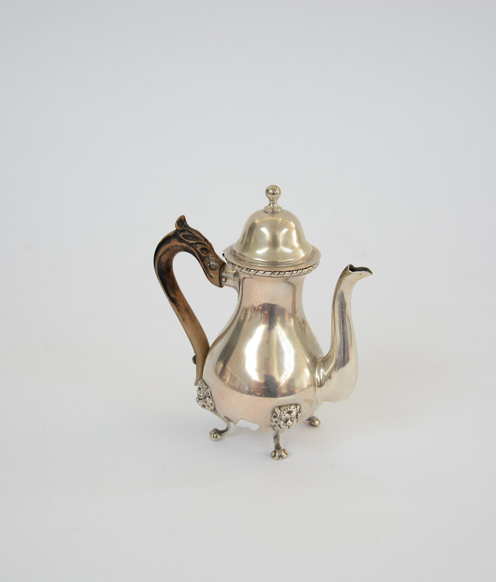 Caffettiera tripode in argento, manico in legno. Italia, inizi sec. XX (h. cm 15,5 ca.) (gr 230 lordi) (difetti)