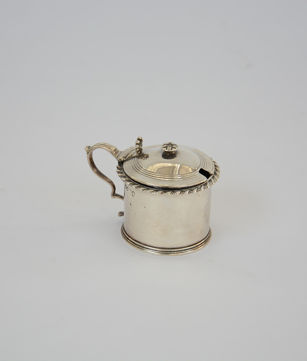 Senapiera in argento di forma cilindrica con superficie liscia incisa e bordo godronato; coperchio con pomolo a bottone e manico ad ansa; contenitore in vetro blu. Londra 1841, argentiere John Evans II (h. cm 6 ca.) (gr 90 ca.) (lievi difetti)