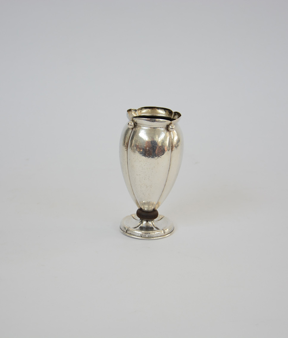 Vasetto in argento con corpo a tulipano decorato da fesonature radiali, superficie martelè ed applicazioni sferiche; piede circolare rastremato, con nodo ligneo. Milano, inizi XX secolo, argentiere Genazzi (h. cm 15) (gr 210 lordi) (difetti) -EN A small silver vase. Italy, 19th-century, silversmith Genazzi (h.cm 15) (gr 210 ca.) (defects)
