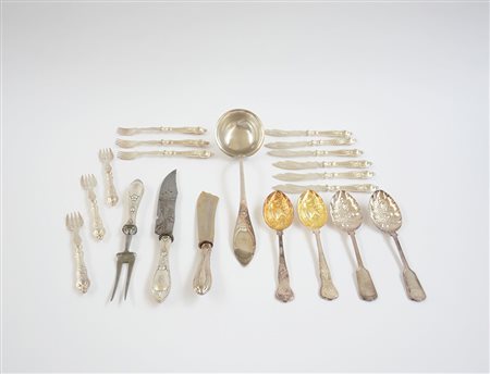 Lotto in metallo argentato composto da quattro posate da frutta secca, dodici posate da pesce, una coppia da arrosto, un mestolo ed un coltello da dolce (difetti)