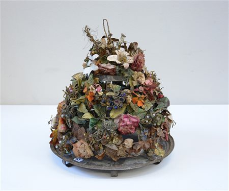 Centrotavola con struttura in metallo decorato con fiocchi e fiori finti. Base tonda con piedini ad anello (d. cm 30xh. cm 38) (difetti)