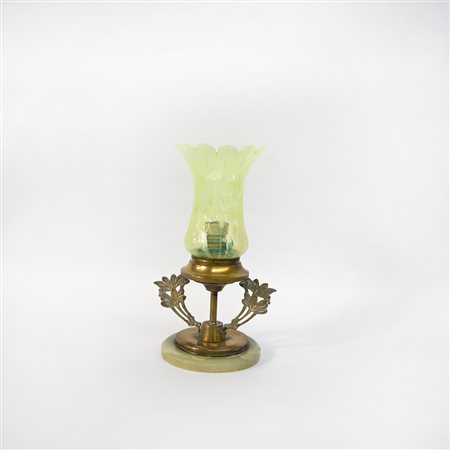 Lampada da tavolo con paralume in vetro verde, base in metallo dorato e onice (difetti)
